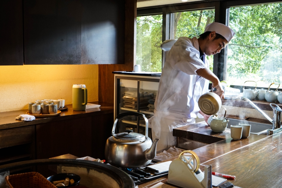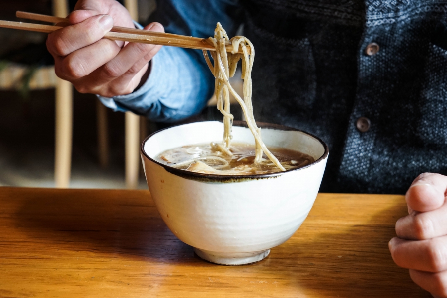 「Murata 不生庵」是由布院頂級溫泉旅館、其中一所「御三間」的「山莊無量塔」所開設的蕎麥麵店,倚傍山崖、綠意滿盈,我一見就鍾情。我們品嚐了這裡的招牌「黑豚蕎麥麵」,豬肉與蕎麥麵在日本是罕見的組合,這裡的黑豚蕎麥麵則好吃極了!黑豚取五花肉部位,滷得稍甜但徹底入味,湯頭也是絲毫不遜色的重口味,以柴魚、小沙丁魚干、青花魚干、香菇、昆布等材料熬煮而成,香醇鮮口;蕎麥麵本身自然不馬虎,以由布院的好水、自家製麵粉及信州蕎麥粉手工揉、切,製成蕎麥粉與麵粉乃九比一的九割蕎麥麵,蕎麥的香氣與顆粒感十分過癮,麵體本身又比一般九割甚至八割的蕎麥麵有嚼勁。肉、湯、麵於是成為均衡的三角,完整而協調,撒點黑胡椒更對味,再為豬肉蘸上柚子胡椒就更完美了。