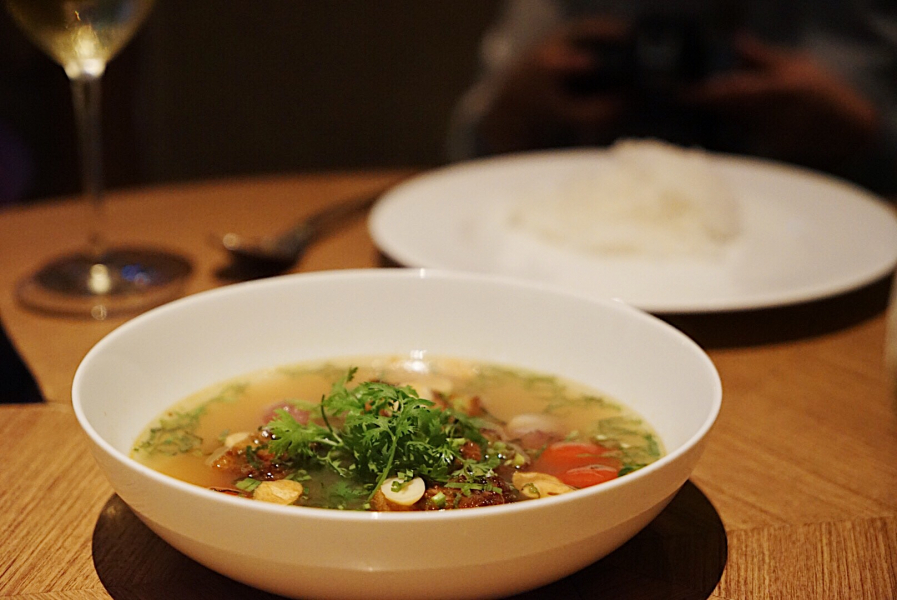 Bo.lan是Nahm的子弟兵,對於傳統菜同樣下足功夫,但有年輕氣盛的創意與野心。那晚的菜好辣!去年可沒這麼讓我的肚子翻攪,但去年的菜也比較平淡,今年則鮮明跌宕,好幾道菜都滋味出眾,譬如炒豬頸肉、船麵湯與小黃瓜河蝦沙拉,都讓我點頭叫好。