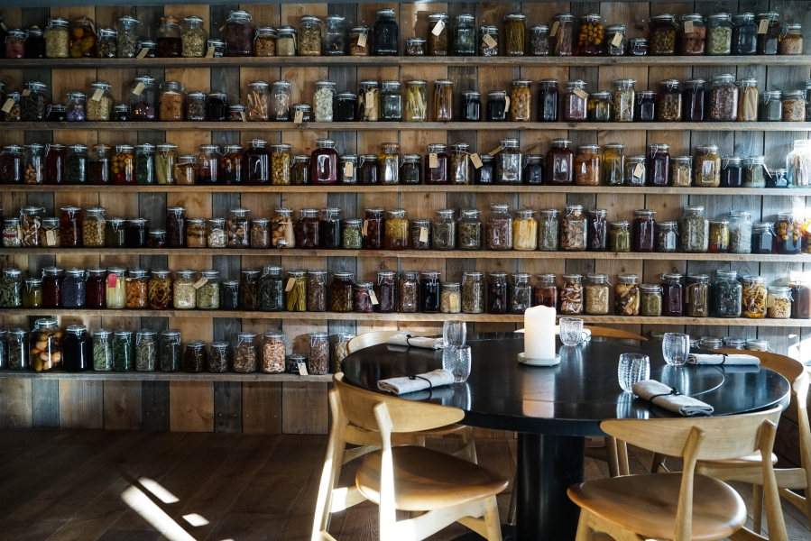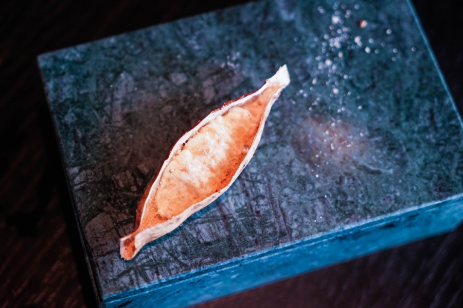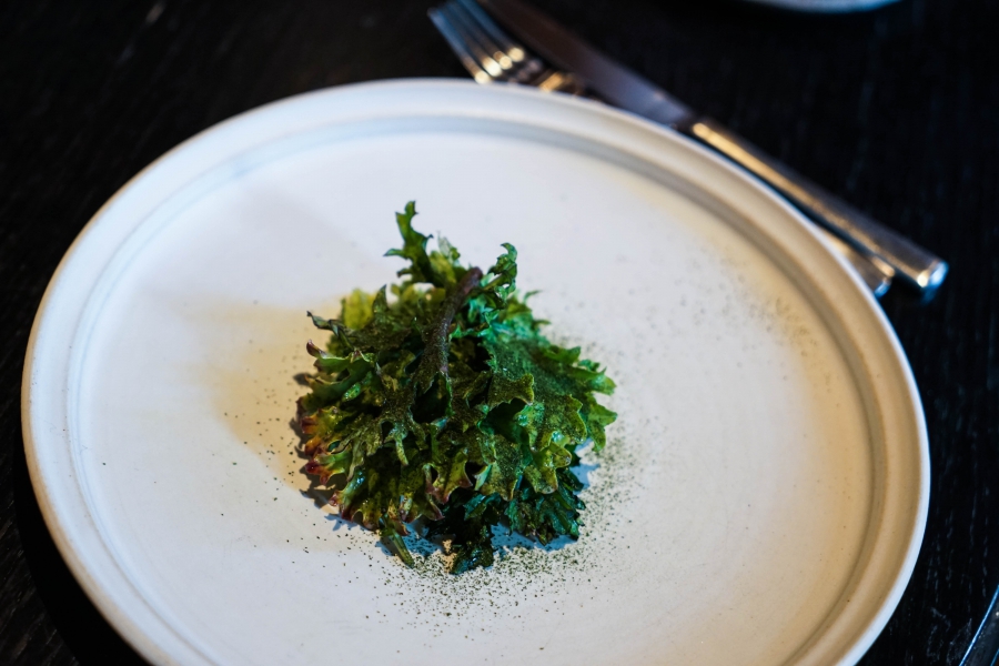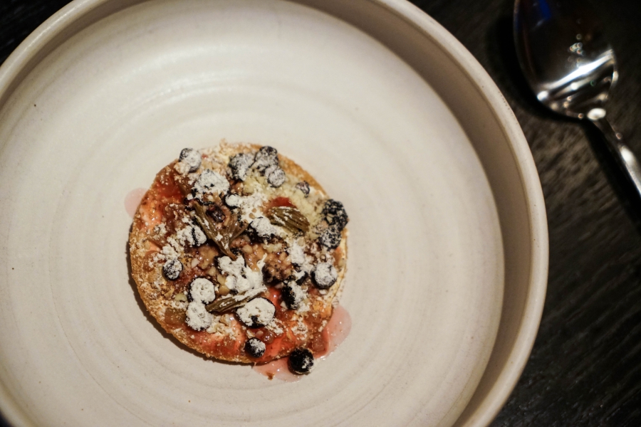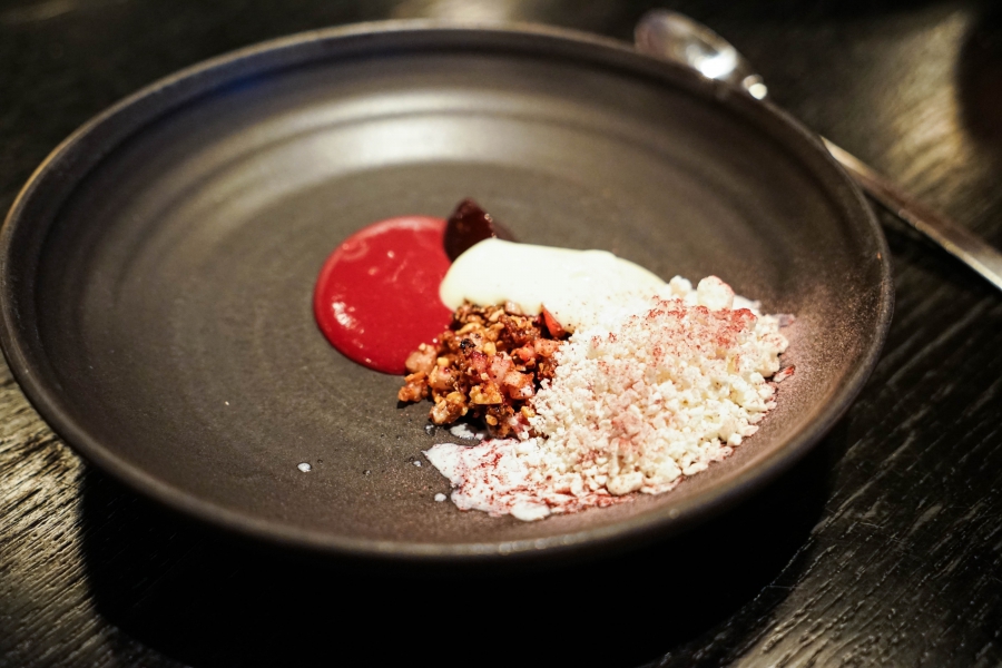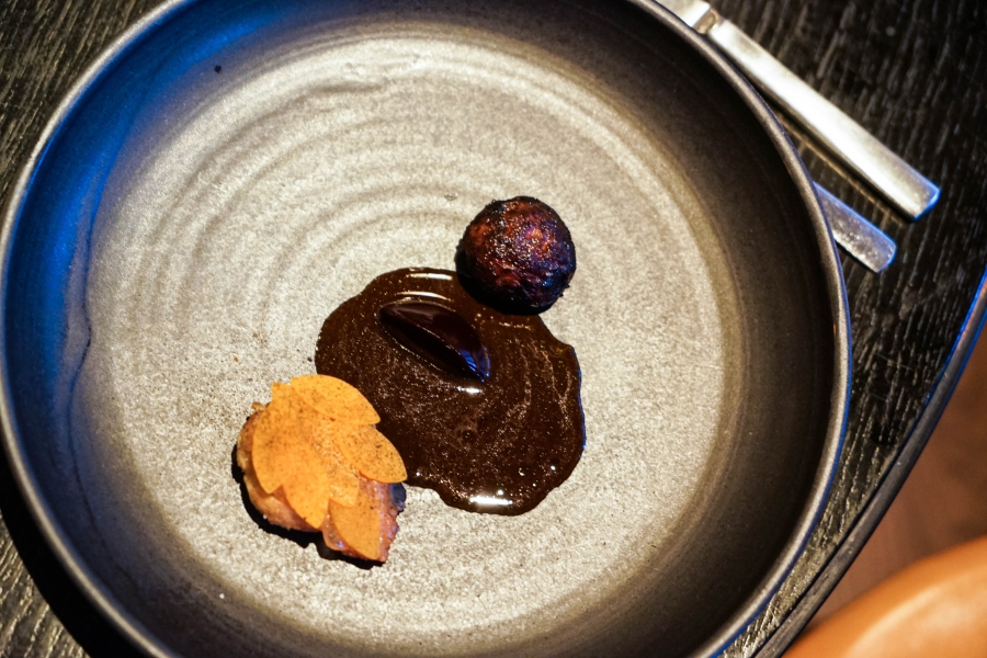Kadeau致力於呈現Bornholm島的飲食風光,其烹飪也依循自然時令,春夏採集、醃漬、發酵,秋冬就使用這些事先保存下來的食材。我們當晚的菜單複雜而精巧,開頭有十道小點,接著有八道料理,除了最後二道出菜有點拖,其他時間都毫無冷場,甚至讓我有些手忙腳亂。開胃小點中,我相當喜歡一道紅甜菜根,經過風乾、裹上黃甜菜根粉,再蘸上花椰菜奶油吃,其口感厚實,好似芒果乾也有點像蒟篛乾,味道濃縮而富含甜味,沾點花椰菜奶油則更顯鮮美。一道洋薑(sunchoke)皮塞龍蝦奶油也很有意思,不僅物盡其用,洋薑近似人參的藥材味與龍蝦奶油也相輔相成;而吃完了洋薑皮,打開底下的蓋子,又是另一道小點:醃漬梭鱸魚(Zander)佐松針膠。不得不說這食器設計實在精緻巧妙!