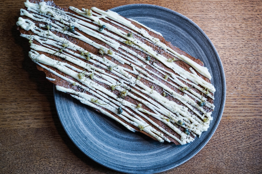 Relae為何如此打動我?看似簡潔卻蘊含深意是我對其傾心的主因。相較於Noma或Kadeau那種複雜精緻的百轉千迴,Relae的料理直爽明快,但當你以為眼見即為所嚐,卻又不是如此。譬如一道洋薑(sunchoke)拌核桃醬,眼見一片白,撥開外層的內裡也是一片白,但外頭是生的波特菇(portobello mushroom),裡頭才是洋薑拌核桃醬,全都切成細絲,讓你分不清誰是誰,但融合在一起的滋味又是這麼有道理—核桃使得洋薑本身的藥材味便柔和,與菇味又很搭,波特菇上頭擠有檸檬汁,突然竄出的酸與鹹使整道菜更加明亮。又如甜點的優格冰沙,飄揚著漂亮的檸檬香氣,我原以為上頭是檸檬皮,一吃卻鹹鹹的,原來是鹹蛋黃啊!優格冰沙、檸檬凝乳、溫蛋黃、鹹蛋黃,這道甜點呈現冰與溫、鹹與甜的對比,尤其甜與鹹、酸的平衡掌握得很好,是富含巧思的傑作。