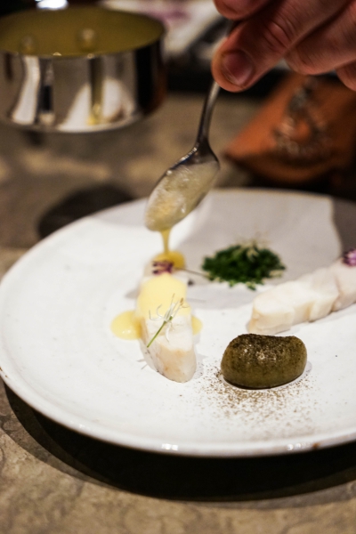 一道蔬菜料理也很精彩。以拉丁文「Satio Tempestas」(意指季節豐收)命名,這道料理使用了39種蔬菜或香草,全來自餐廳的二個農場,或生、或煙漬、或烤,有葉菜也有根莖類,結合炸魚鱗、焦糖洋蔥醬、自家製酸奶油及蔬菜高湯油醋醬,果真豐收而富足。