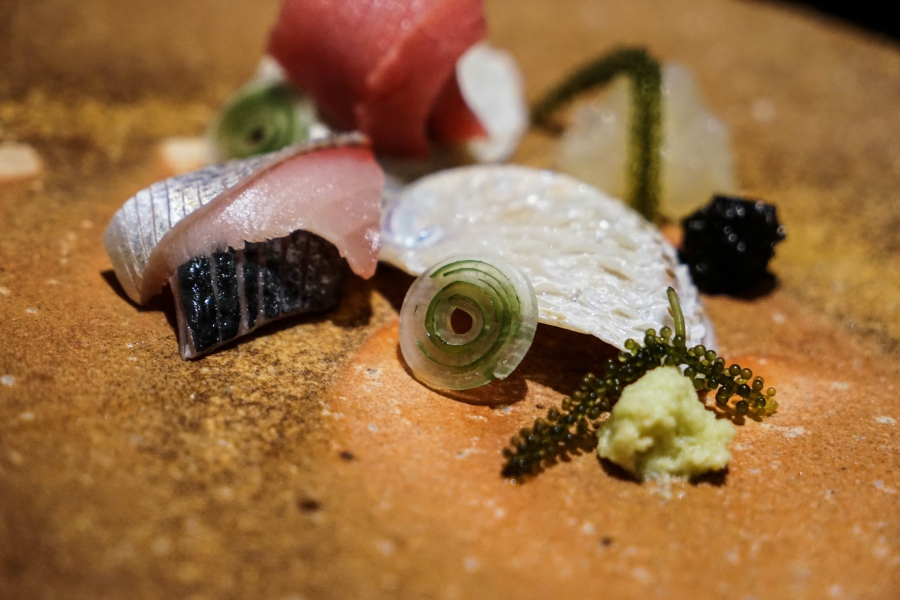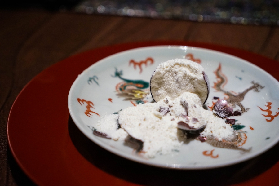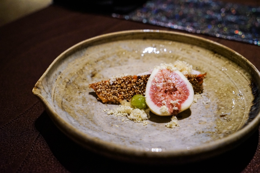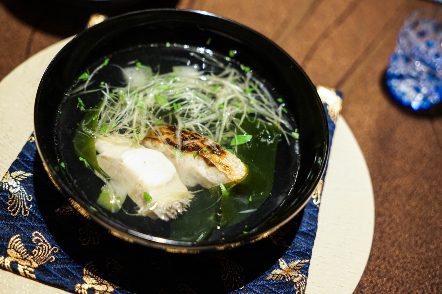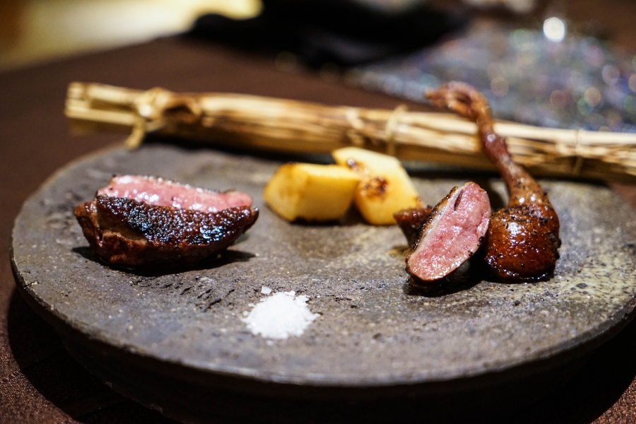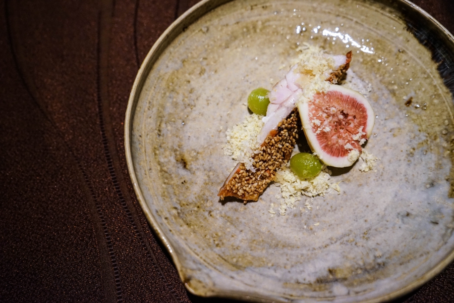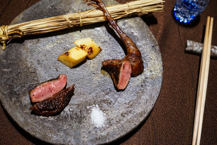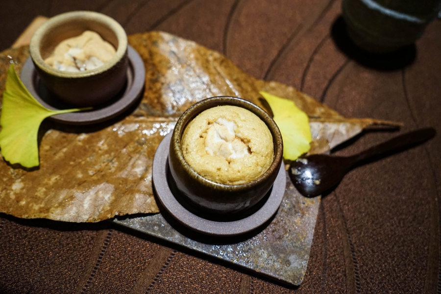 好幾道菜,未嚐其味已聞其香,且是撲鼻的香。甲魚豆腐,一上桌就芬芳滿盈,原來是炸過的三星蔥「作祟」,甲魚高湯鮮得緊,甲魚裙邊富含膠質、軟Q黏嘴,與雞蛋加寒天做成的假豆腐你濃我濃,生鮮與酥炸三星蔥則提味增香,這餐一開始就火力全開;招牌的0.9高湯,以紅喉、鮑魚作為主角,茗荷清洌的氣味首先竄出,再飲湯則溫潤悠揚,而後品嚐經過細緻處理的鮑魚及紅喉,鮑魚煮得一咬即斷,紅喉烤過,二者都有下足鹹味,撐住整碗湯品;香煎金目鯛,魚皮上的白芝麻散發堅果香氣,入口則成雙倍酥脆的魚皮,魚肉鮮嫩濕潤,搭佐栗子絲、栗子泥與無花果,秋意滿載;特製乳鴿土佐燒,飄散燻香及馬告的柑橘辛香,低溫油封後再炭烤至外皮極脆,而後用稻草燻製,瑰紅但不見血的完美熟度實在美味;燻製鮭魚卵釜飯,乘著特製推車上華麗登場,日本柚子的鮮明香味鑽入鼻間,彰化二水的越光米被高湯烹得飽滿而兼具彈性與黏性,加上鮮鹹的鮭魚卵,怎能抗拒?