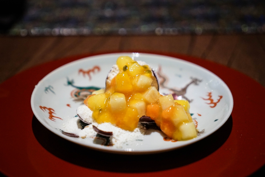 好幾道菜則呈現巧思或精工。七星斑佐秋葵,特別的是那台灣檸檬做成的醬,混了柴魚粉,鮮而明亮,與用昆布醃過的七星斑生魚片極搭;櫻花蝦煎餅,完全顧名思義,櫻花蝦整齊排列並油炸成長條,上頭綴以來自北海道的海膽及牡丹蝦,既香酥又濃郁;白甘鯛實為馬頭魚,白嫩魚片裡包著以糯米製成的道明寺粉,像飯卻比飯更鬆化,與同樣鬆化的魚肉及鮮美的魚高湯芡汁同食,溫柔婉約;百香果糖,則是龍吟招牌甜點「-196度C草莓」的變奏,也是我第一次品嚐此物,薄脆拉糖裡包有用液態氮極速冷凍而成的百香果果汁粉,敲碎後淋上用百香果、木瓜、梨、芒果做成的熱果醬,冷熱交替的酸甜滋味著實美妙。