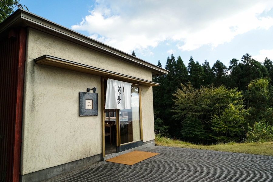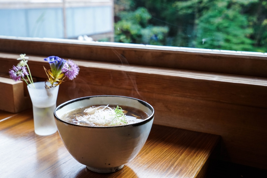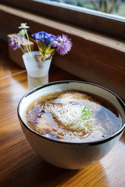 「Murata 不生庵」是由布院頂級溫泉旅館、其中一所「御三間」的「山莊無量塔」所開設的蕎麥麵店,倚傍山崖、綠意滿盈,我一見就鍾情。我們品嚐了這裡的招牌「黑豚蕎麥麵」,豬肉與蕎麥麵在日本是罕見的組合,這裡的黑豚蕎麥麵則好吃極了!黑豚取五花肉部位,滷得稍甜但徹底入味,湯頭也是絲毫不遜色的重口味,以柴魚、小沙丁魚干、青花魚干、香菇、昆布等材料熬煮而成,香醇鮮口;蕎麥麵本身自然不馬虎,以由布院的好水、自家製麵粉及信州蕎麥粉手工揉、切,製成蕎麥粉與麵粉乃九比一的九割蕎麥麵,蕎麥的香氣與顆粒感十分過癮,麵體本身又比一般九割甚至八割的蕎麥麵有嚼勁。肉、湯、麵於是成為均衡的三角,完整而協調,撒點黑胡椒更對味,再為豬肉蘸上柚子胡椒就更完美了。