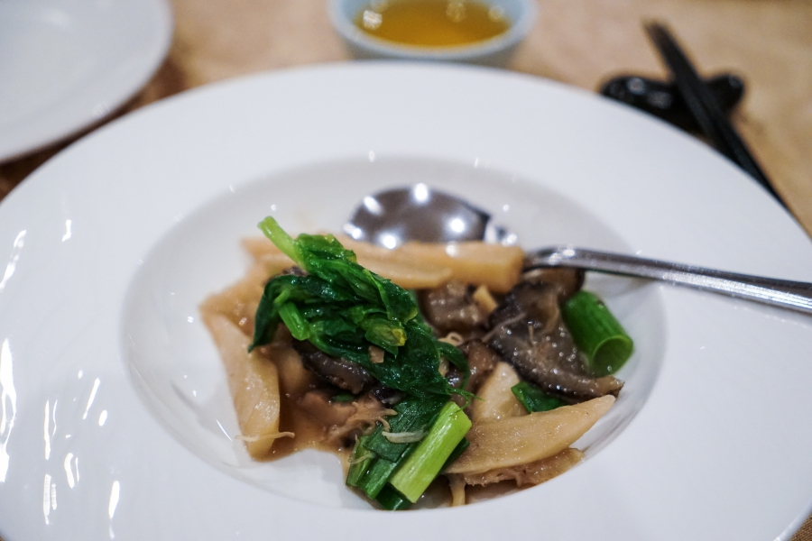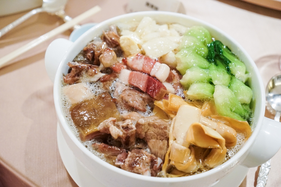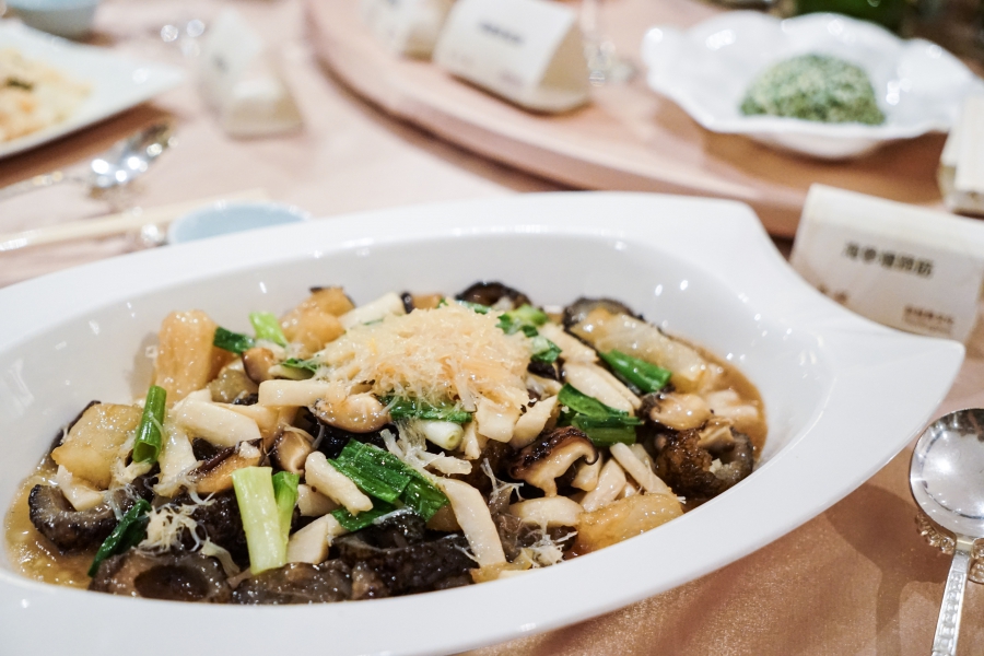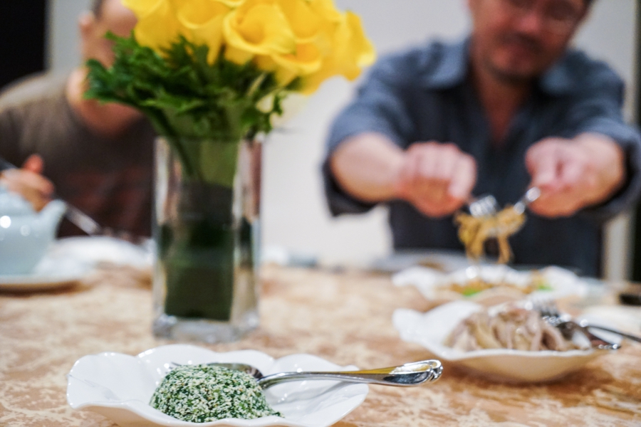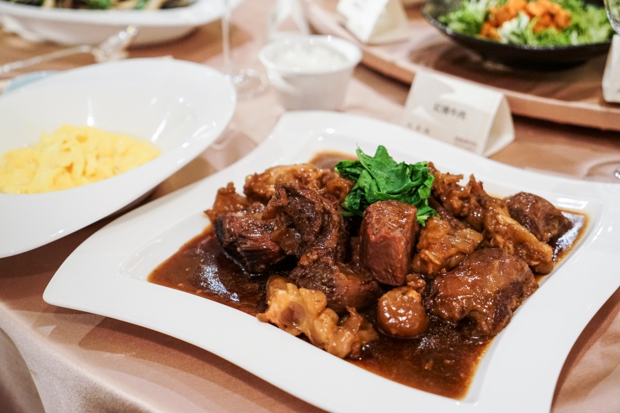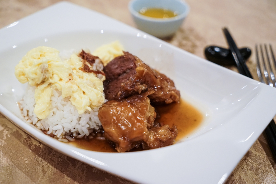 今日的午宴自然有這道紅燒牛肉,同樣以詹家自創的蛋包飯形式上桌。我沒吃過宣一女士做的紅燒牛肉,但去年底因為採訪詹先生之故,很幸運地吃到了詹先生的版本,豪邁直爽的醬味讓我大呼過癮;天香樓版本的則相對淡雅,也比較甜口,且在原本僅有的醬油、糖之外另行加了八角。和詹先生做的像不像?自然不完全一樣;詹先生版和宣一女士版又有幾分相似?雖然詹先生今天又說他想做到100%相同,但焦桐老師直言,詹先生自己廚藝就佳,何必拘泥於宣一女士的味道呢。
