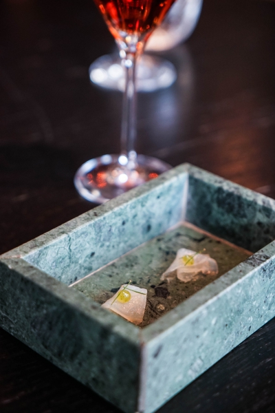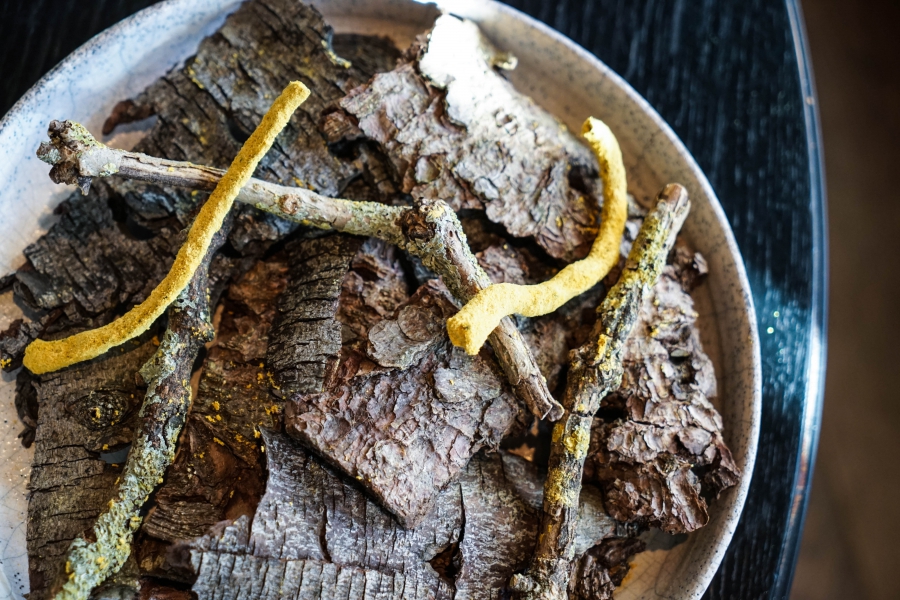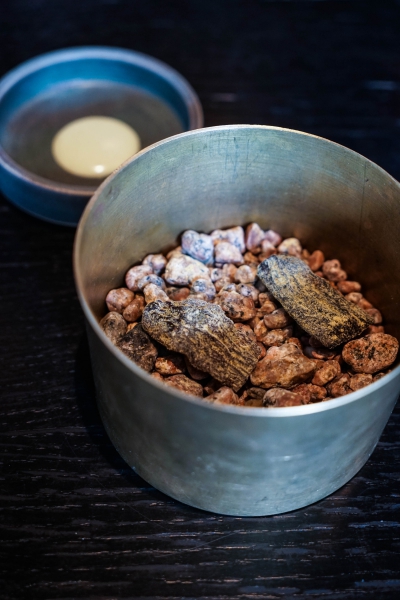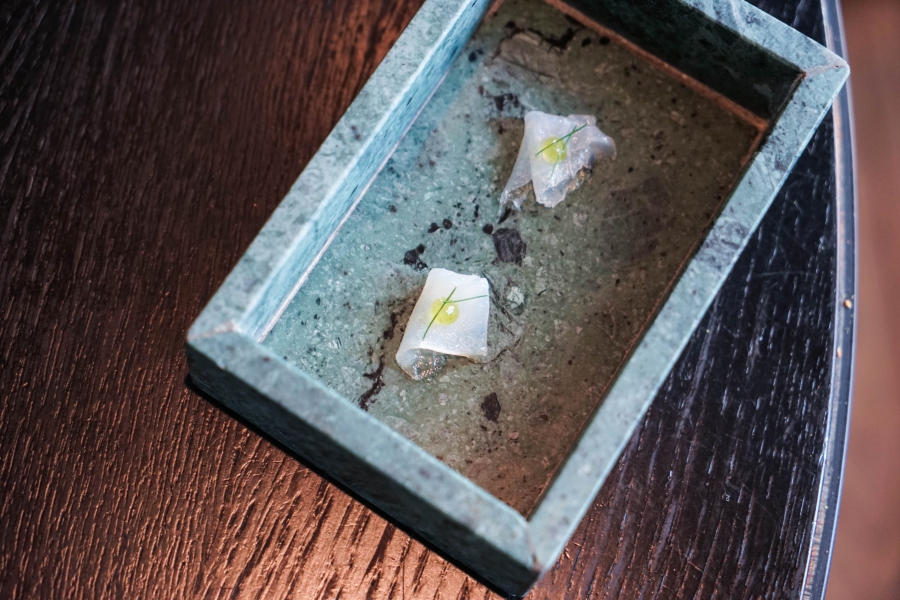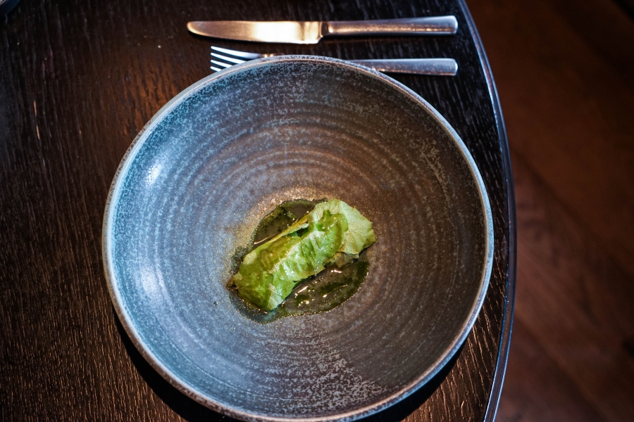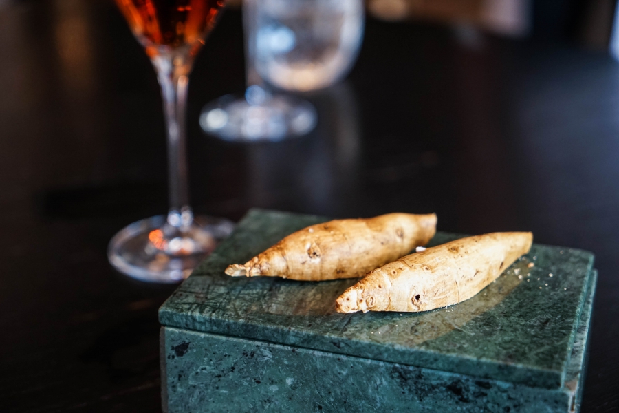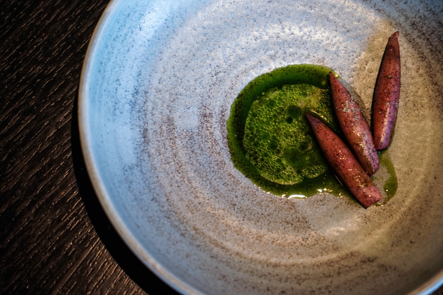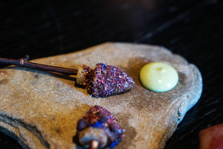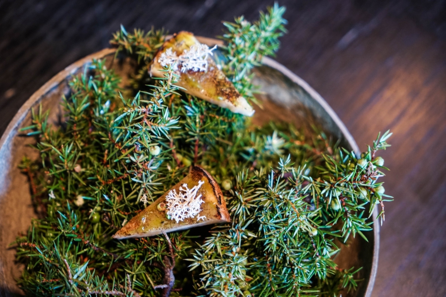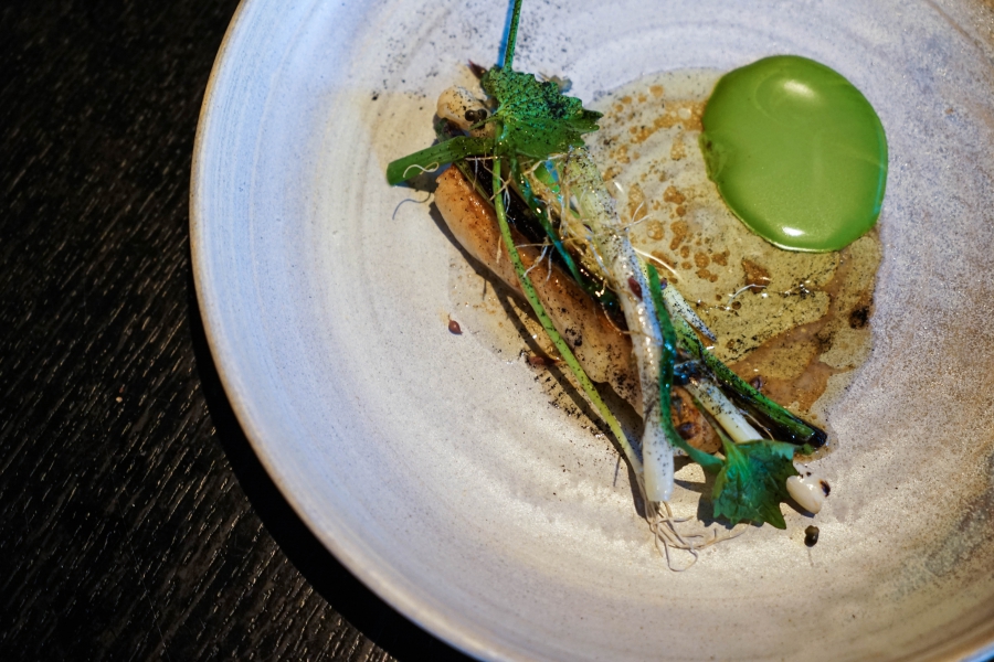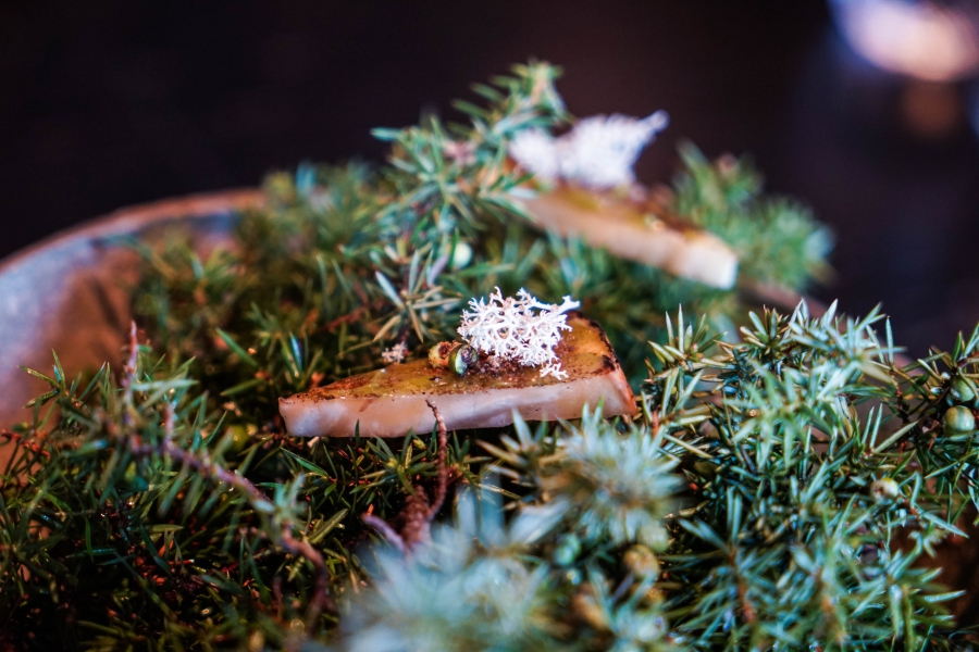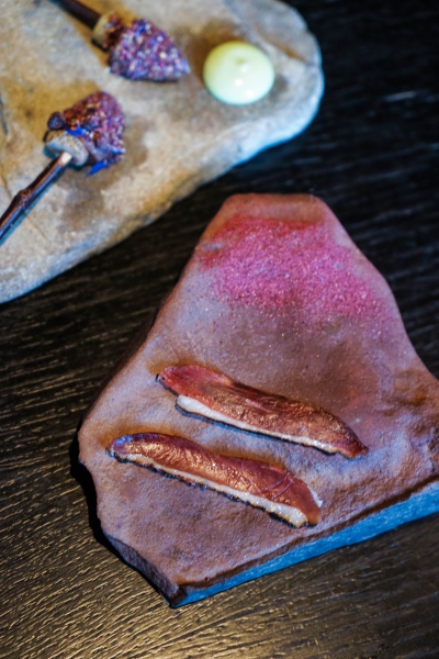 Kadeau致力於呈現Bornholm島的飲食風光,其烹飪也依循自然時令,春夏採集、醃漬、發酵,秋冬就使用這些事先保存下來的食材。我們當晚的菜單複雜而精巧,開頭有十道小點,接著有八道料理,除了最後二道出菜有點拖,其他時間都毫無冷場,甚至讓我有些手忙腳亂。開胃小點中,我相當喜歡一道紅甜菜根,經過風乾、裹上黃甜菜根粉,再蘸上花椰菜奶油吃,其口感厚實,好似芒果乾也有點像蒟篛乾,味道濃縮而富含甜味,沾點花椰菜奶油則更顯鮮美。一道洋薑(sunchoke)皮塞龍蝦奶油也很有意思,不僅物盡其用,洋薑近似人參的藥材味與龍蝦奶油也相輔相成;而吃完了洋薑皮,打開底下的蓋子,又是另一道小點:醃漬梭鱸魚(Zander)佐松針膠。不得不說這食器設計實在精緻巧妙!