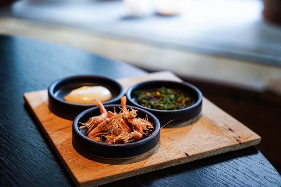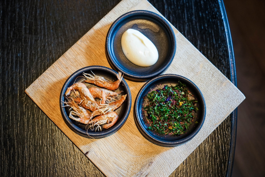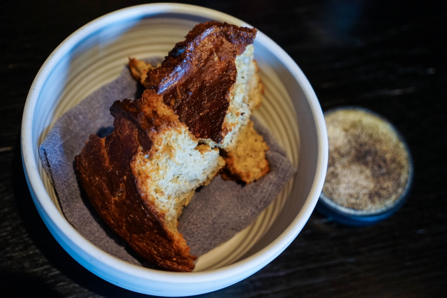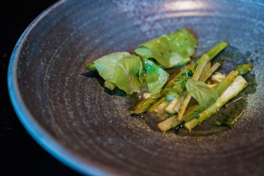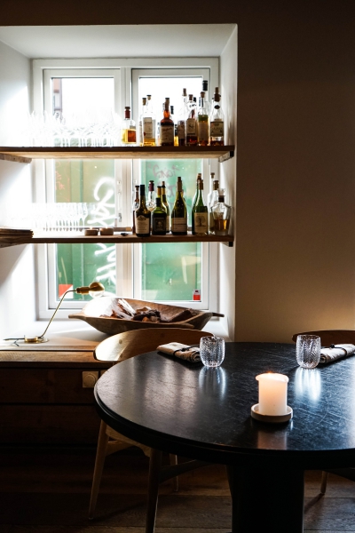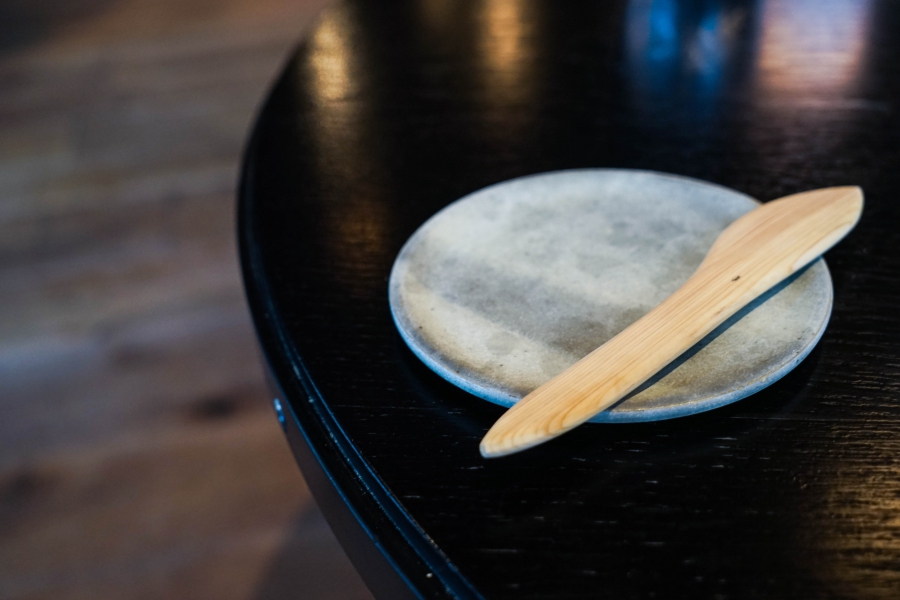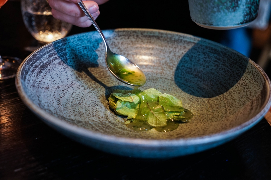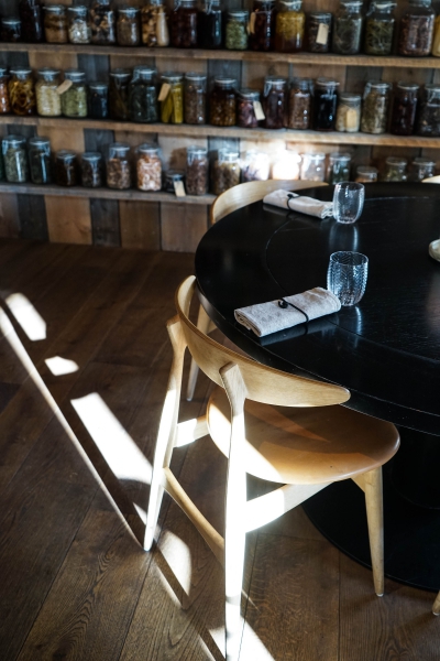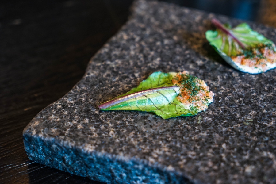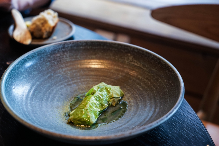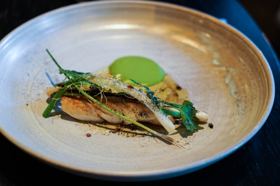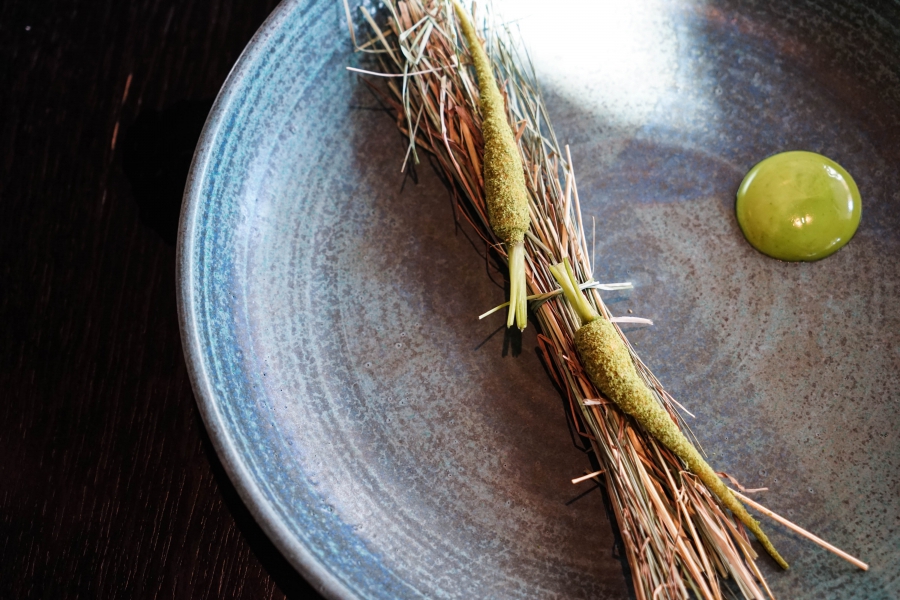 Kadeau致力於呈現Bornholm島的飲食風光,其烹飪也依循自然時令,春夏採集、醃漬、發酵,秋冬就使用這些事先保存下來的食材。我們當晚的菜單複雜而精巧,開頭有十道小點,接著有八道料理,除了最後二道出菜有點拖,其他時間都毫無冷場,甚至讓我有些手忙腳亂。開胃小點中,我相當喜歡一道紅甜菜根,經過風乾、裹上黃甜菜根粉,再蘸上花椰菜奶油吃,其口感厚實,好似芒果乾也有點像蒟篛乾,味道濃縮而富含甜味,沾點花椰菜奶油則更顯鮮美。一道洋薑(sunchoke)皮塞龍蝦奶油也很有意思,不僅物盡其用,洋薑近似人參的藥材味與龍蝦奶油也相輔相成;而吃完了洋薑皮,打開底下的蓋子,又是另一道小點:醃漬梭鱸魚(Zander)佐松針膠。不得不說這食器設計實在精緻巧妙!