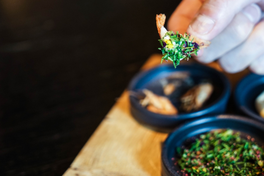 正式料理中,我則喜歡一道大蝦(langoustine)。與Noma作法有點像又有點不像,雷同部分在於蝦肉同樣經過輕煎,不同部分則在於佐料,運用不同質地與風味的花椰菜:生的、醃漬過的、打成泥的,搭上綜合食用花、榛果粒,以及玫瑰醋及李子汁做成的湯,繽紛柔美,酸甜馥郁,是春意盎然的一道作品。