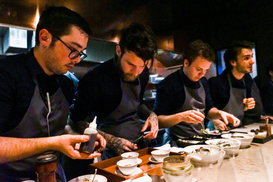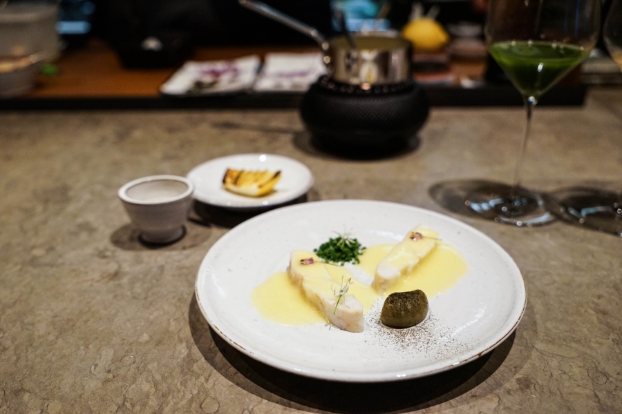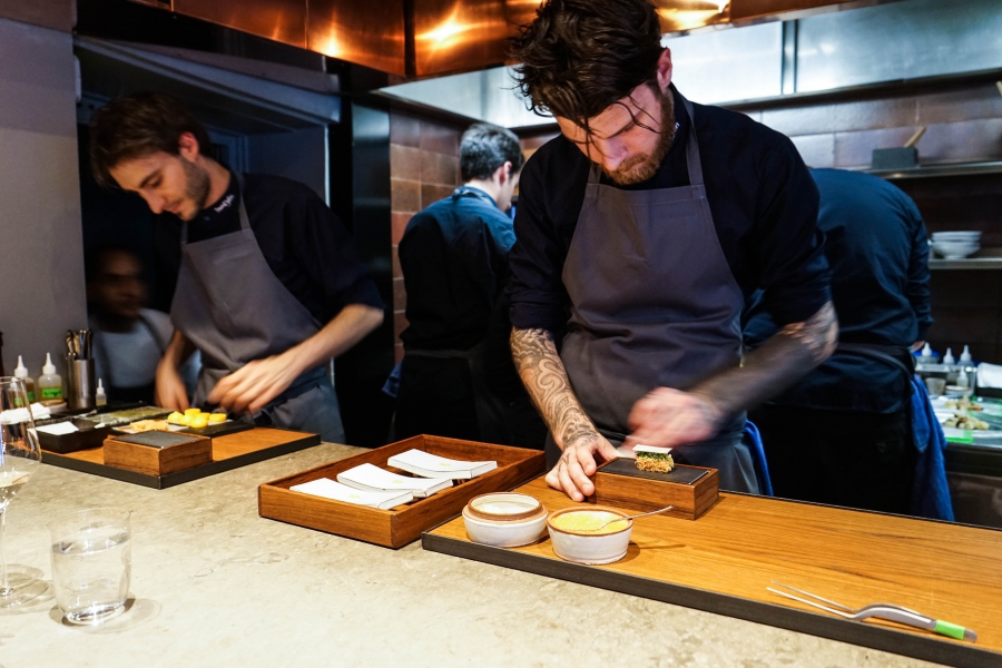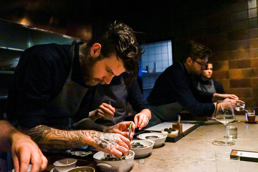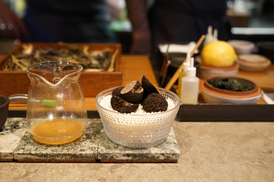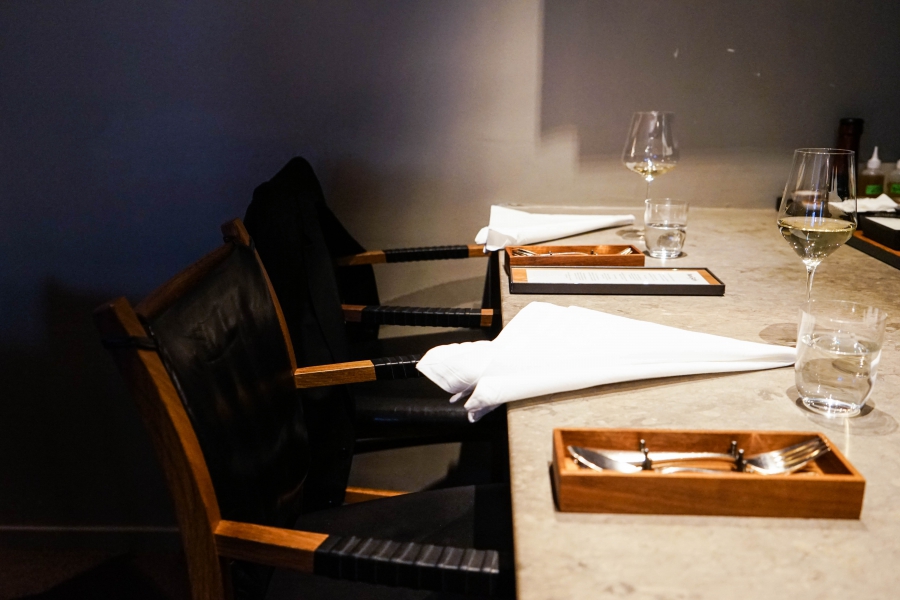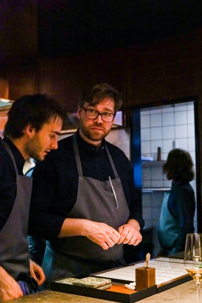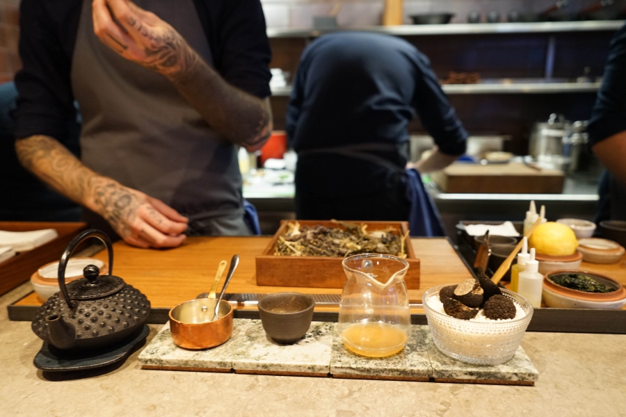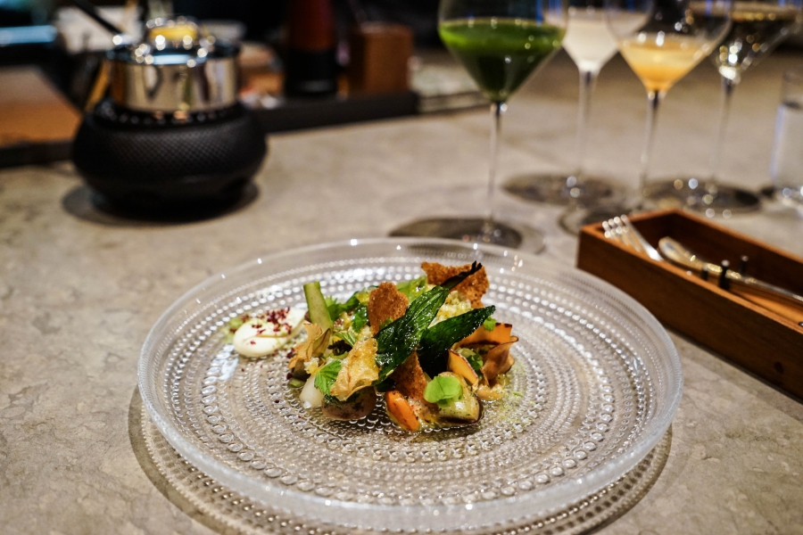 我被安排坐在出餐檯前,這是最佳的單人用餐座位,因為整頓晚餐就像一場讓人目不暇給的大秀,即便我一個人也沒有時間無聊;在我面前的廚師們則直接為我上菜、服務,我也因此能與他們聊天。只可惜Bjorn Frantzén 本人當天不站出餐檯,不然就能一直拍他的特寫了(笑)。