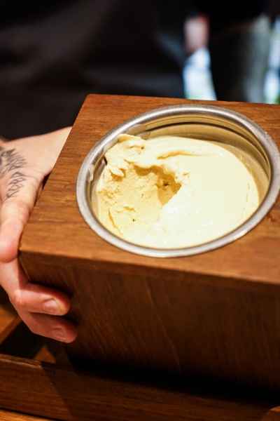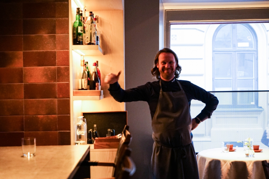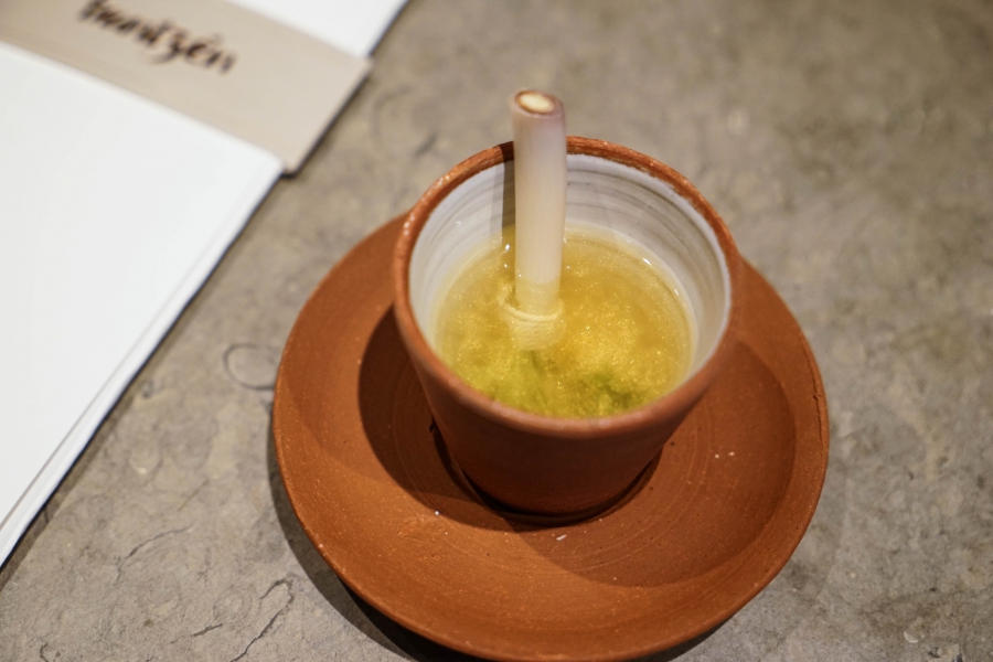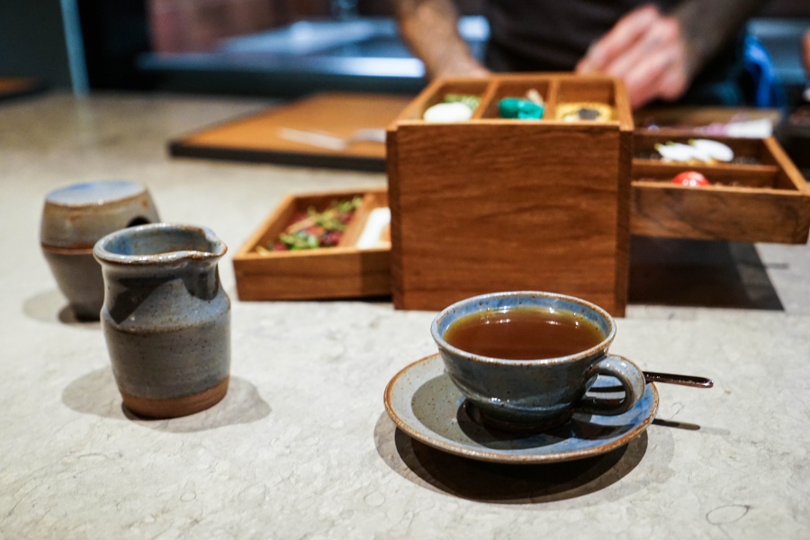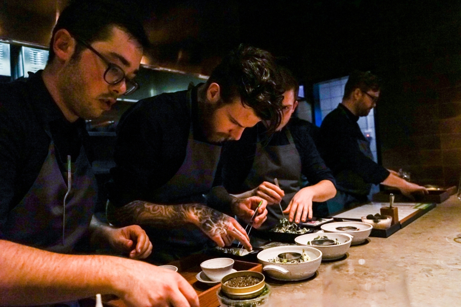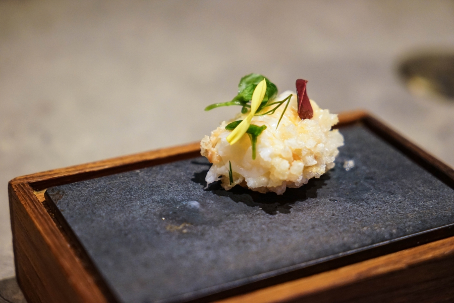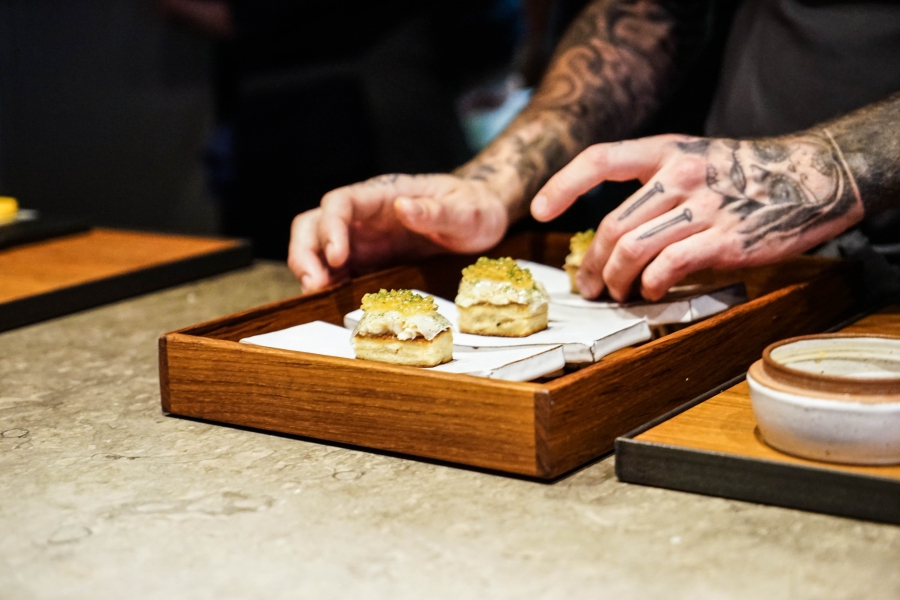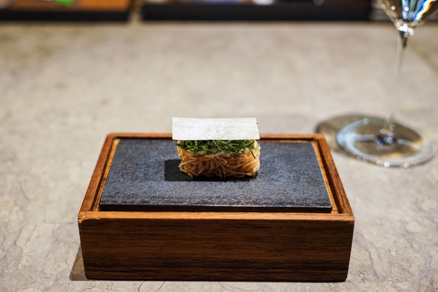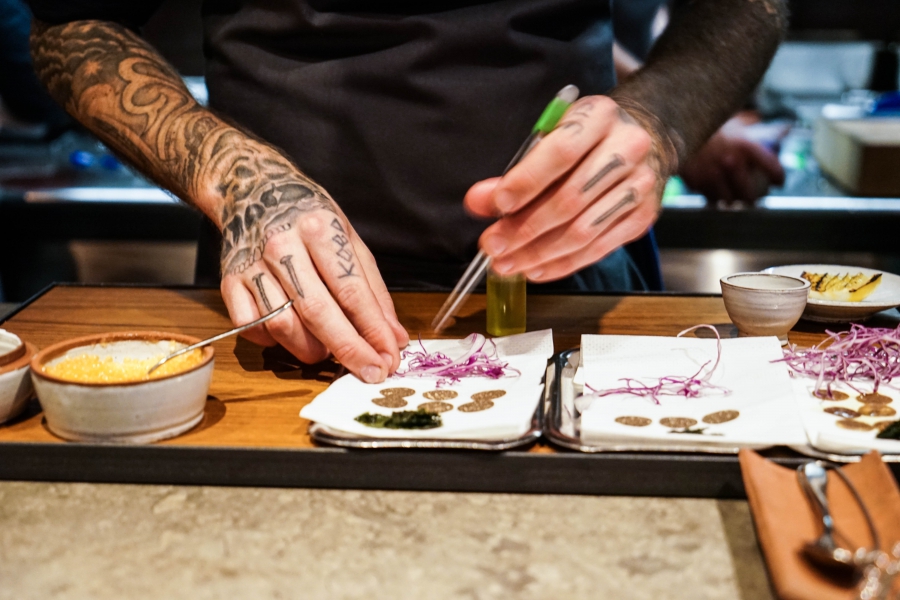 我被安排坐在出餐檯前,這是最佳的單人用餐座位,因為整頓晚餐就像一場讓人目不暇給的大秀,即便我一個人也沒有時間無聊;在我面前的廚師們則直接為我上菜、服務,我也因此能與他們聊天。只可惜Bjorn Frantzén 本人當天不站出餐檯,不然就能一直拍他的特寫了(笑)。