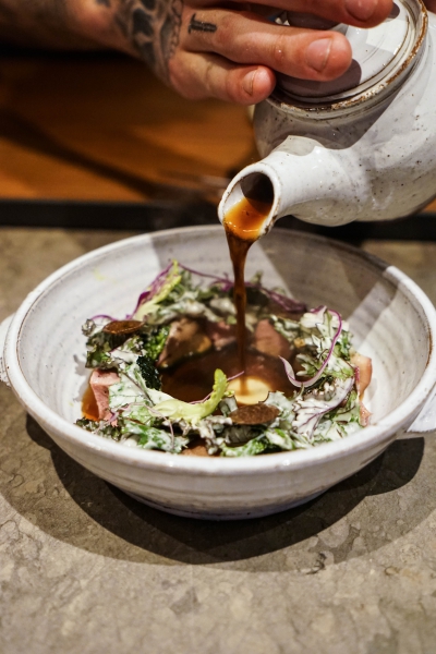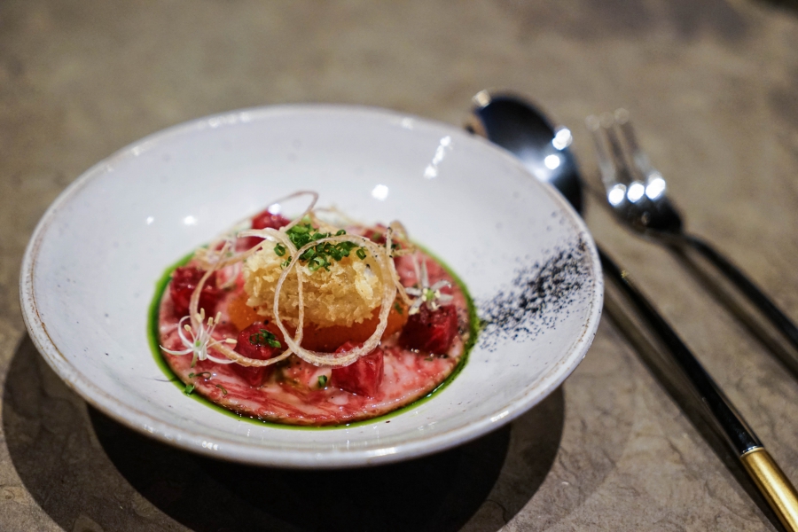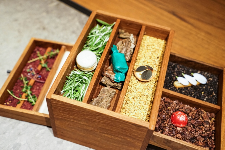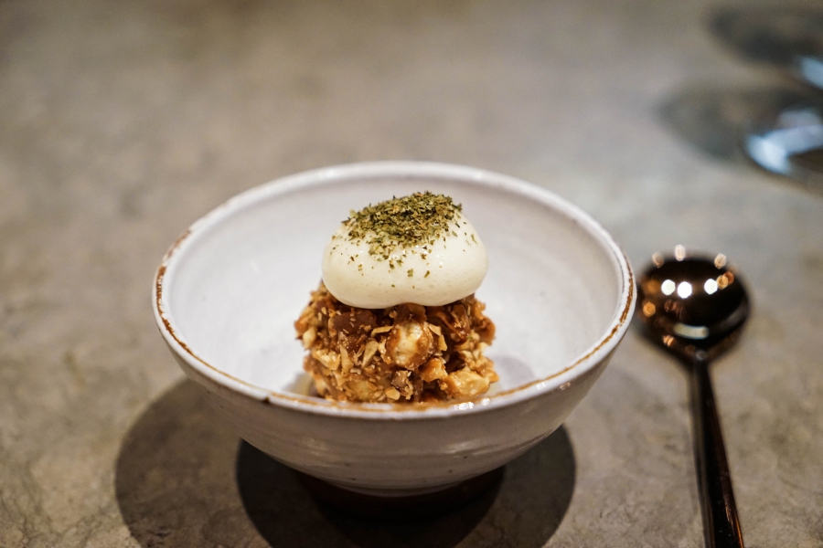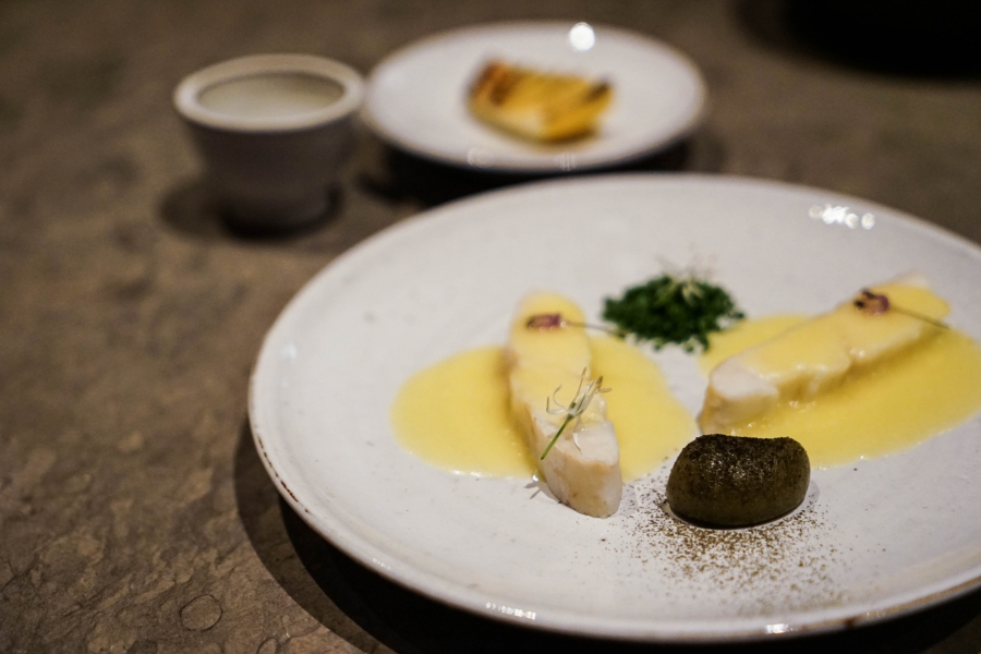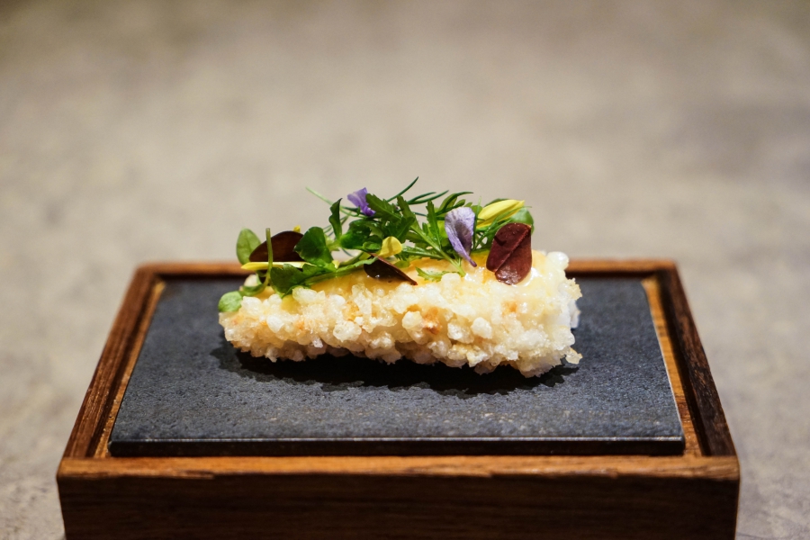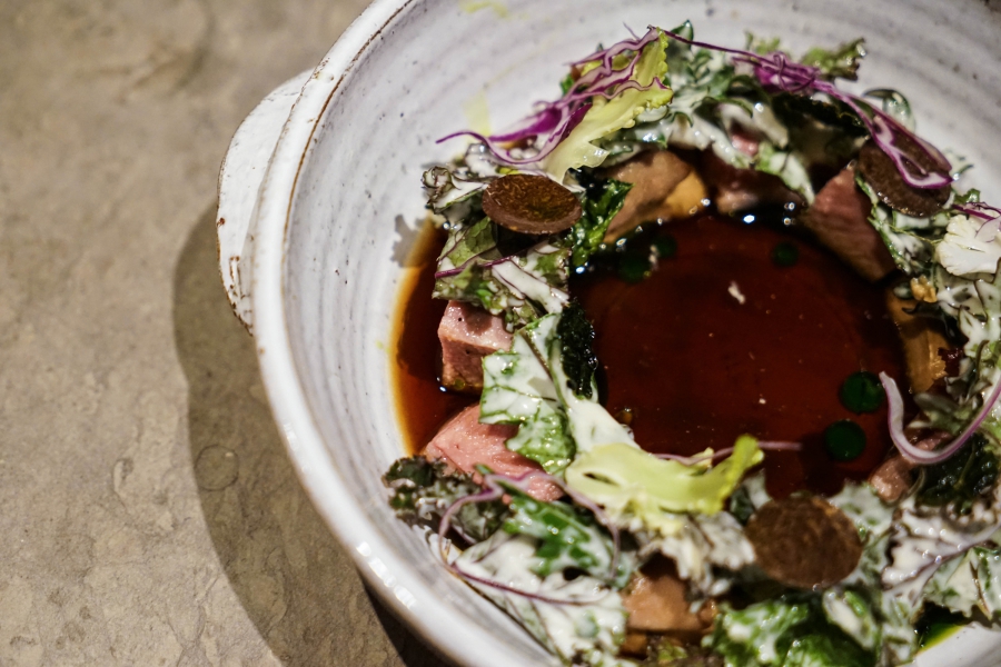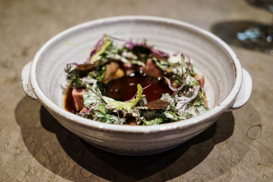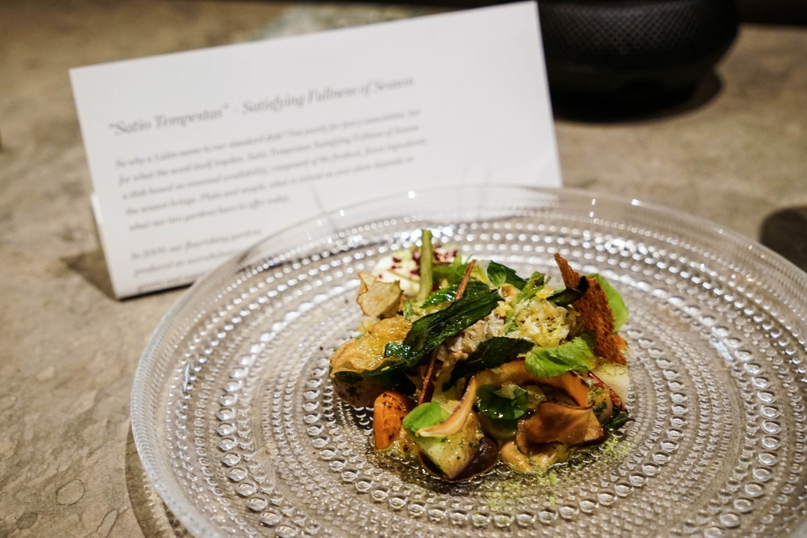 一道蔬菜料理也很精彩。以拉丁文「Satio Tempestas」(意指季節豐收)命名,這道料理使用了39種蔬菜或香草,全來自餐廳的二個農場,或生、或煙漬、或烤,有葉菜也有根莖類,結合炸魚鱗、焦糖洋蔥醬、自家製酸奶油及蔬菜高湯油醋醬,果真豐收而富足。