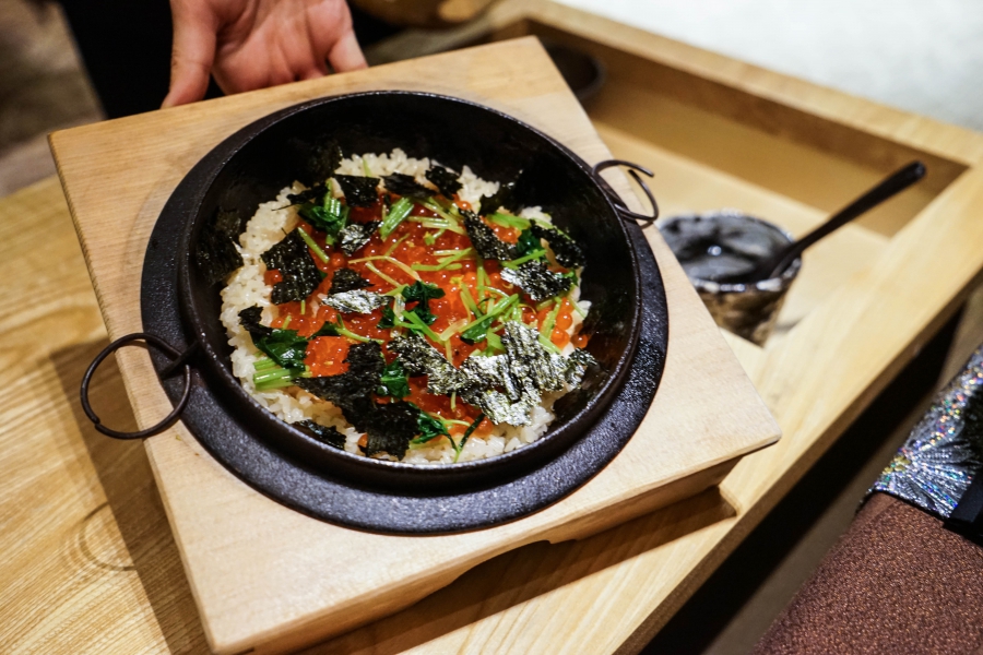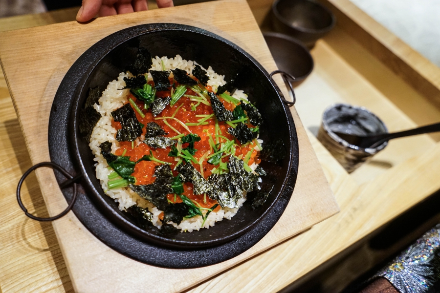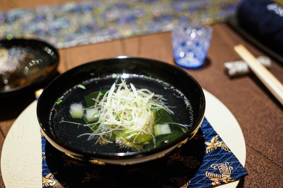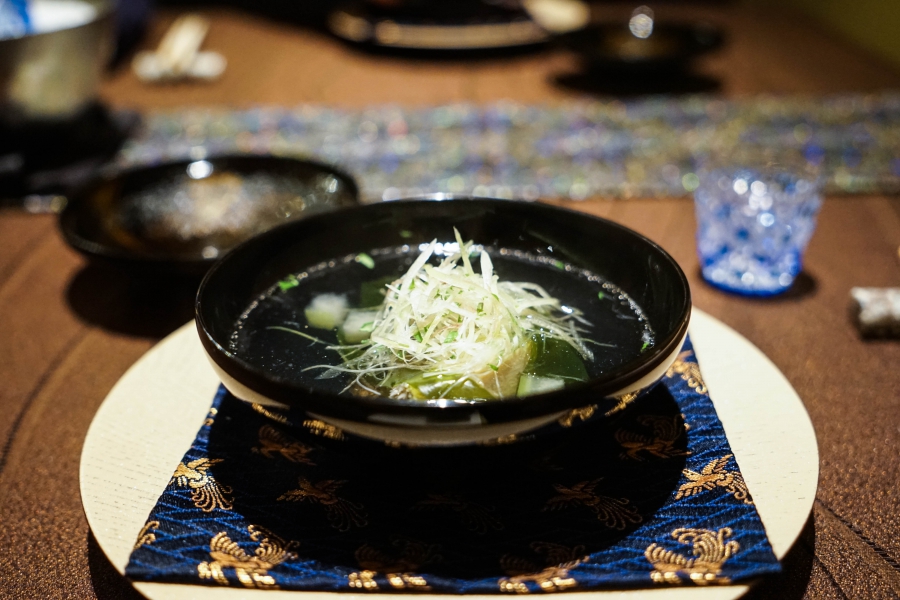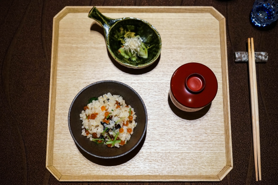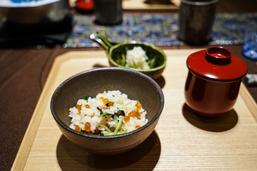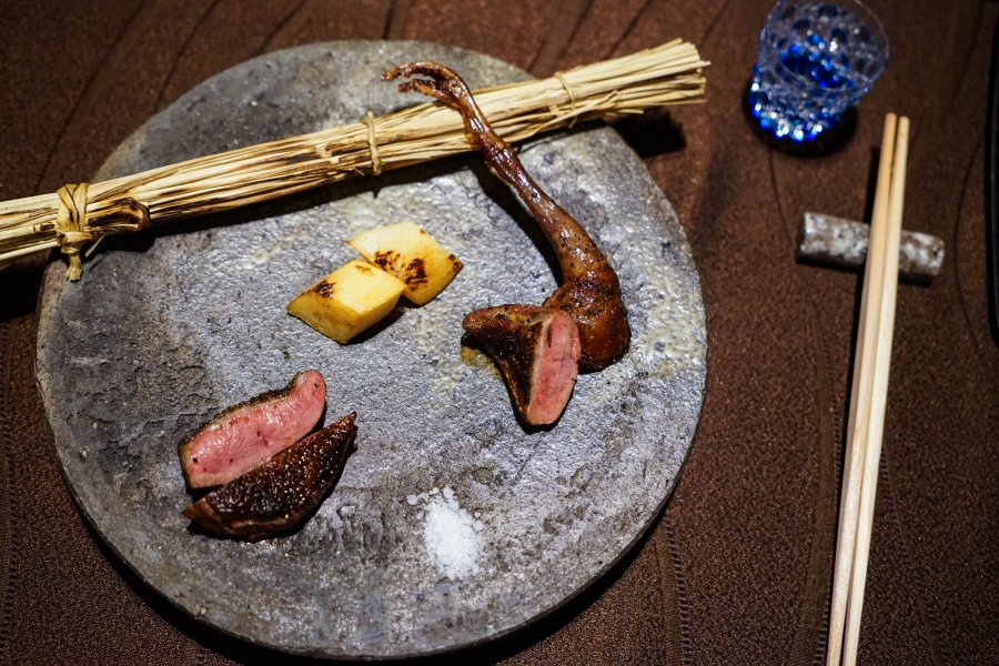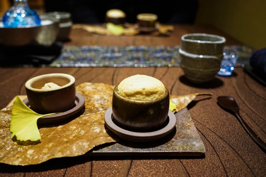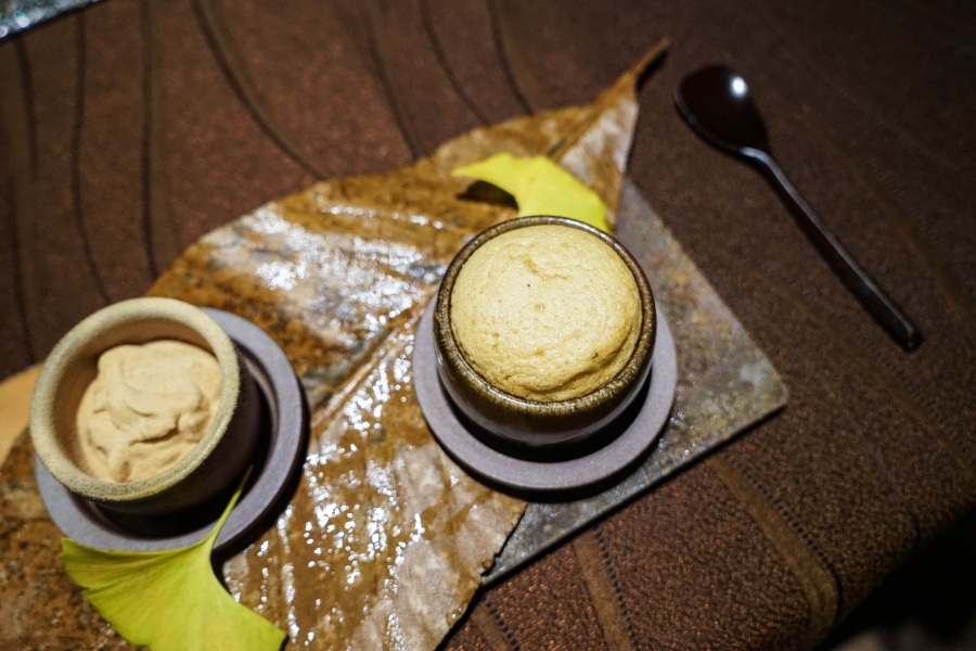 好幾道菜,未嚐其味已聞其香,且是撲鼻的香。甲魚豆腐,一上桌就芬芳滿盈,原來是炸過的三星蔥「作祟」,甲魚高湯鮮得緊,甲魚裙邊富含膠質、軟Q黏嘴,與雞蛋加寒天做成的假豆腐你濃我濃,生鮮與酥炸三星蔥則提味增香,這餐一開始就火力全開;招牌的0.9高湯,以紅喉、鮑魚作為主角,茗荷清洌的氣味首先竄出,再飲湯則溫潤悠揚,而後品嚐經過細緻處理的鮑魚及紅喉,鮑魚煮得一咬即斷,紅喉烤過,二者都有下足鹹味,撐住整碗湯品;香煎金目鯛,魚皮上的白芝麻散發堅果香氣,入口則成雙倍酥脆的魚皮,魚肉鮮嫩濕潤,搭佐栗子絲、栗子泥與無花果,秋意滿載;特製乳鴿土佐燒,飄散燻香及馬告的柑橘辛香,低溫油封後再炭烤至外皮極脆,而後用稻草燻製,瑰紅但不見血的完美熟度實在美味;燻製鮭魚卵釜飯,乘著特製推車上華麗登場,日本柚子的鮮明香味鑽入鼻間,彰化二水的越光米被高湯烹得飽滿而兼具彈性與黏性,加上鮮鹹的鮭魚卵,怎能抗拒?