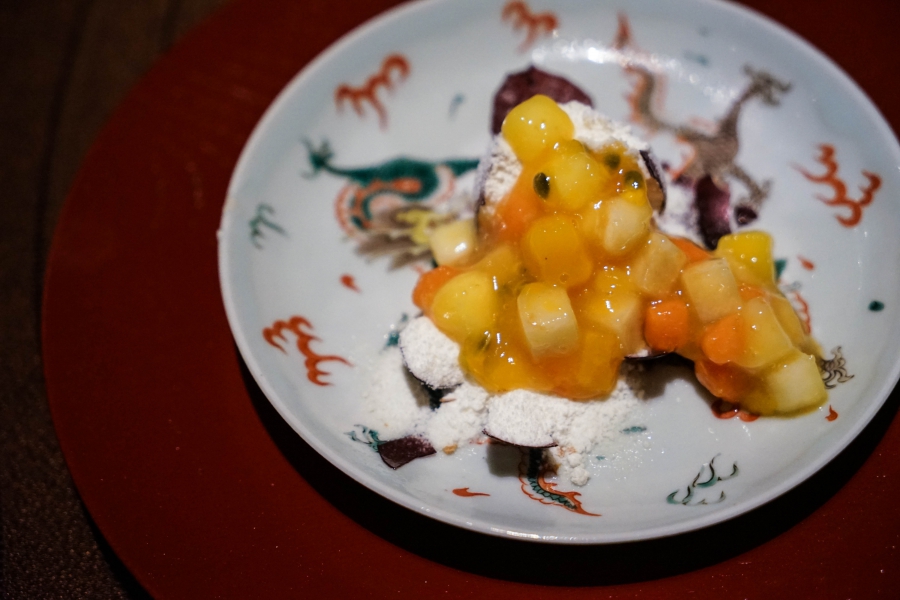好幾道菜則呈現巧思或精工。七星斑佐秋葵,特別的是那台灣檸檬做成的醬,混了柴魚粉,鮮而明亮,與用昆布醃過的七星斑生魚片極搭;櫻花蝦煎餅,完全顧名思義,櫻花蝦整齊排列並油炸成長條,上頭綴以來自北海道的海膽及牡丹蝦,既香酥又濃郁;白甘鯛實為馬頭魚,白嫩魚片裡包著以糯米製成的道明寺粉,像飯卻比飯更鬆化,與同樣鬆化的魚肉及鮮美的魚高湯芡汁同食,溫柔婉約;百香果糖,則是龍吟招牌甜點「-196度C草莓」的變奏,也是我第一次品嚐此物,薄脆拉糖裡包有用液態氮極速冷凍而成的百香果果汁粉,敲碎後淋上用百香果、木瓜、梨、芒果做成的熱果醬,冷熱交替的酸甜滋味著實美妙。