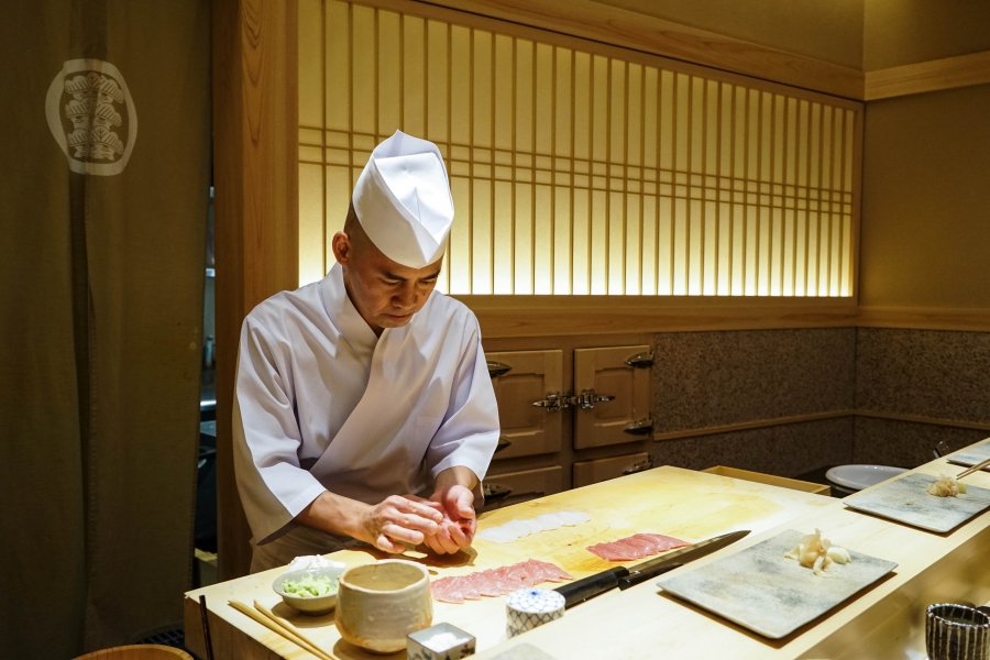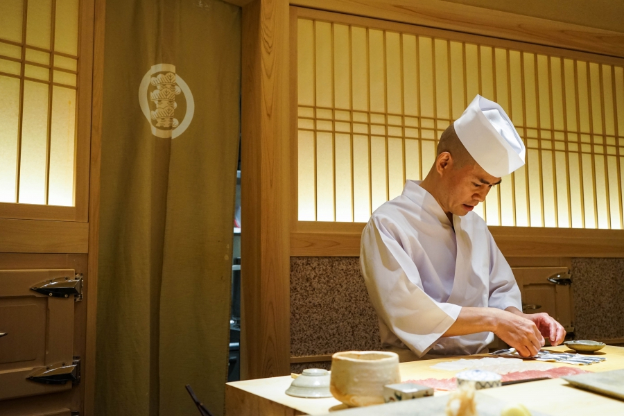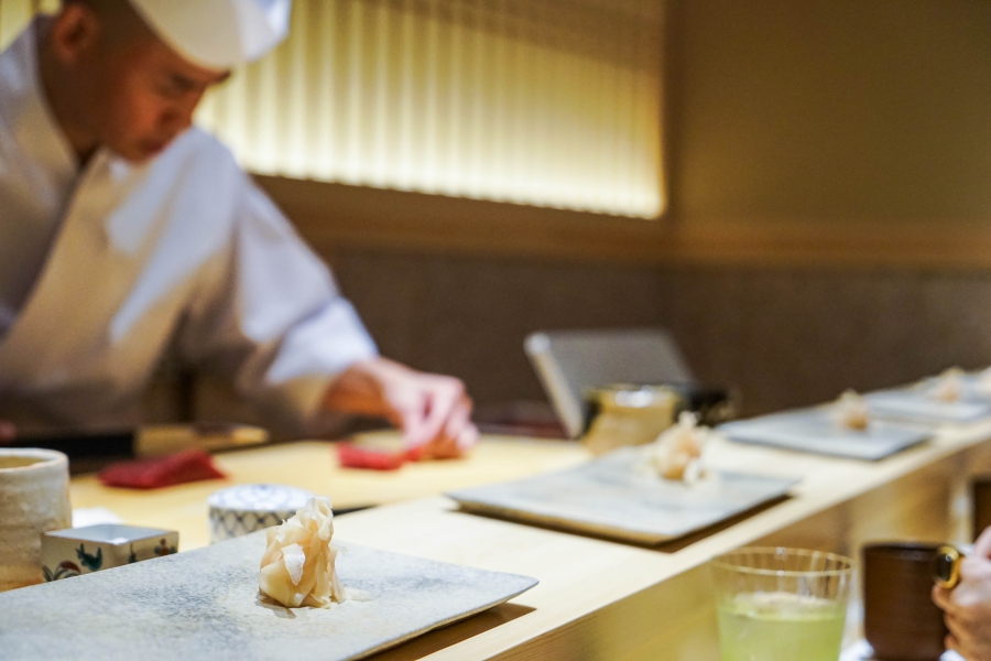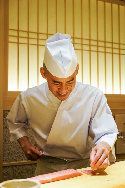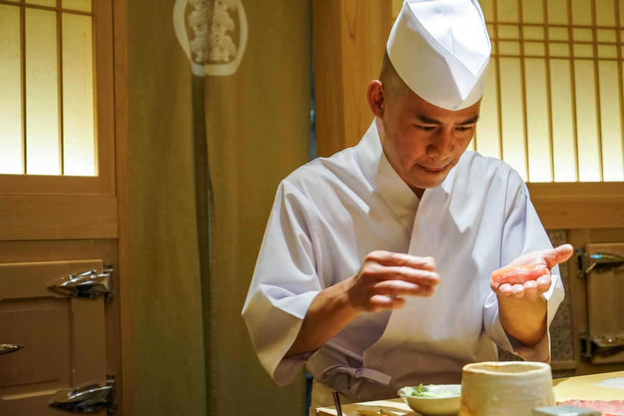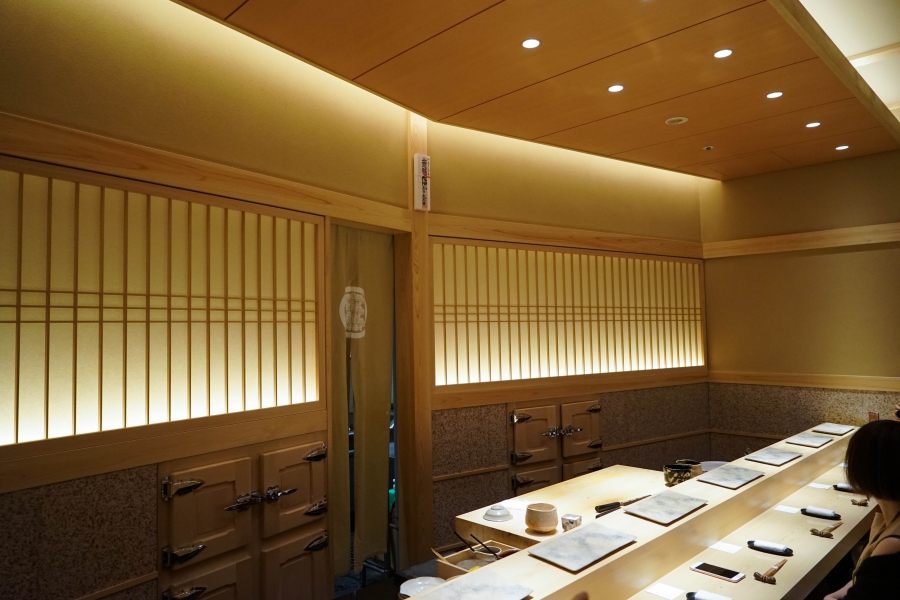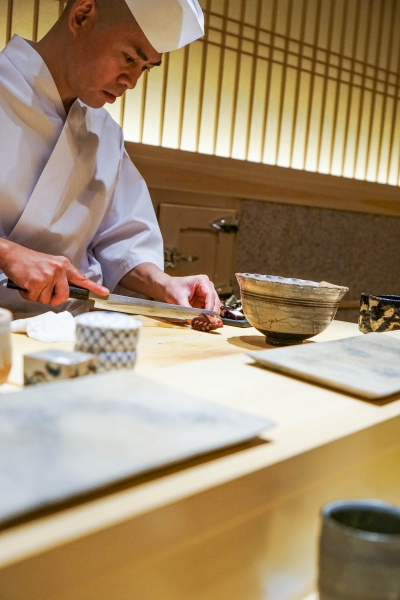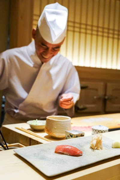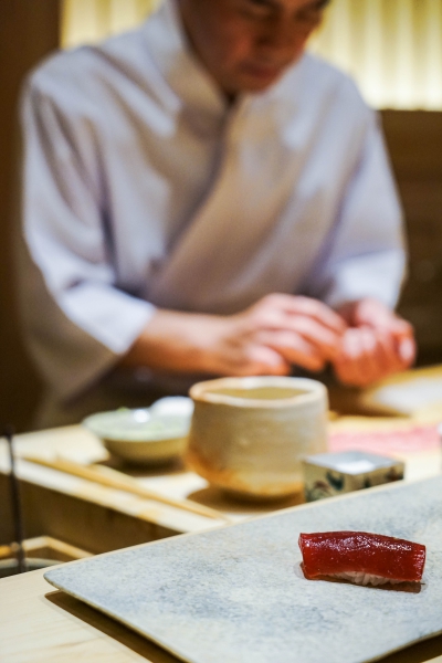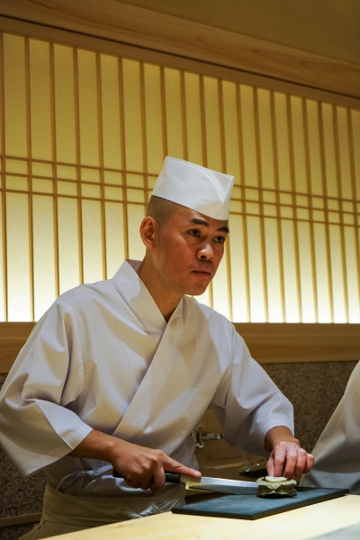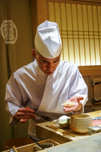齋藤壽司自二〇〇八年起,以一年摘一星的速度迅速晉升米其林三星,店主齋藤孝司相當年輕,現年不過四十二歲。其原址位於東京赤坂區一處停車場的對面,一年半前才搬到六本木的現址,店面變得明亮了,卻仍堅守迷你尺寸,幾乎由齋藤師傅一人在板前處理所有魚料。