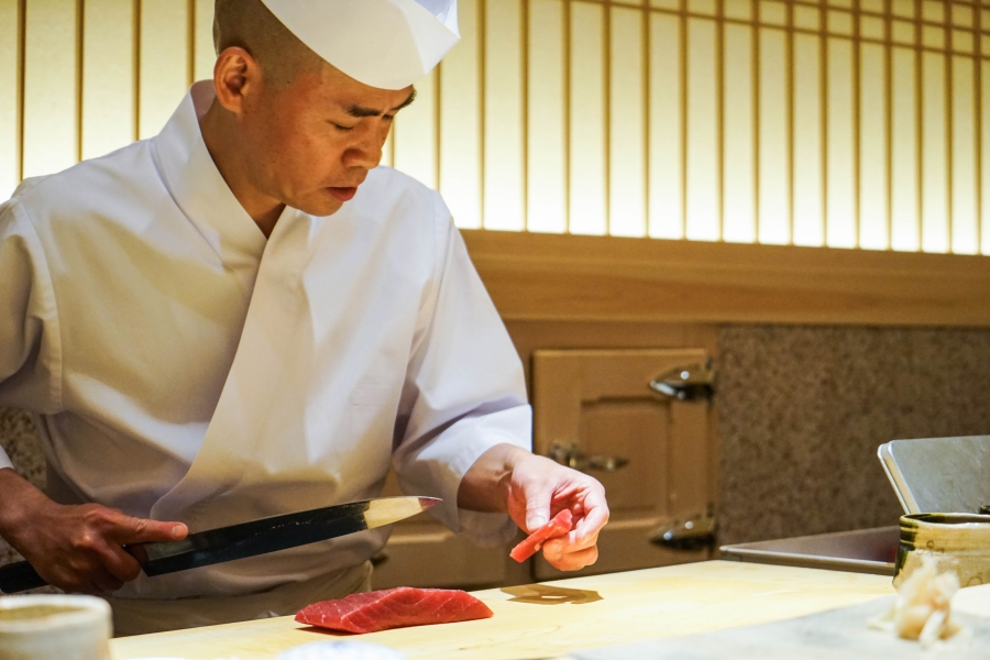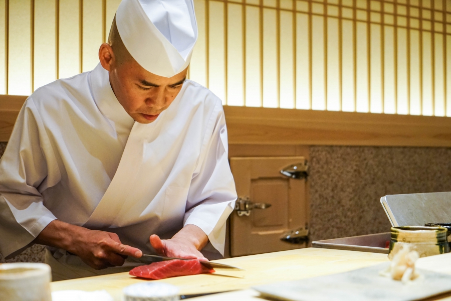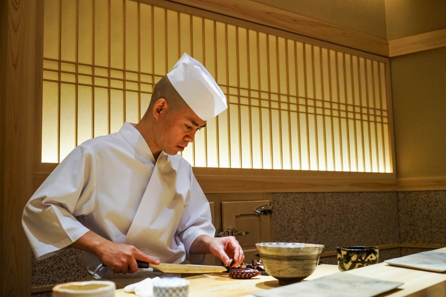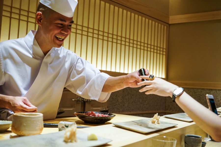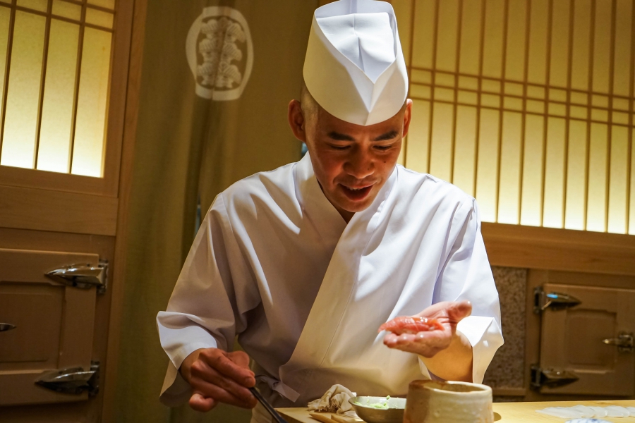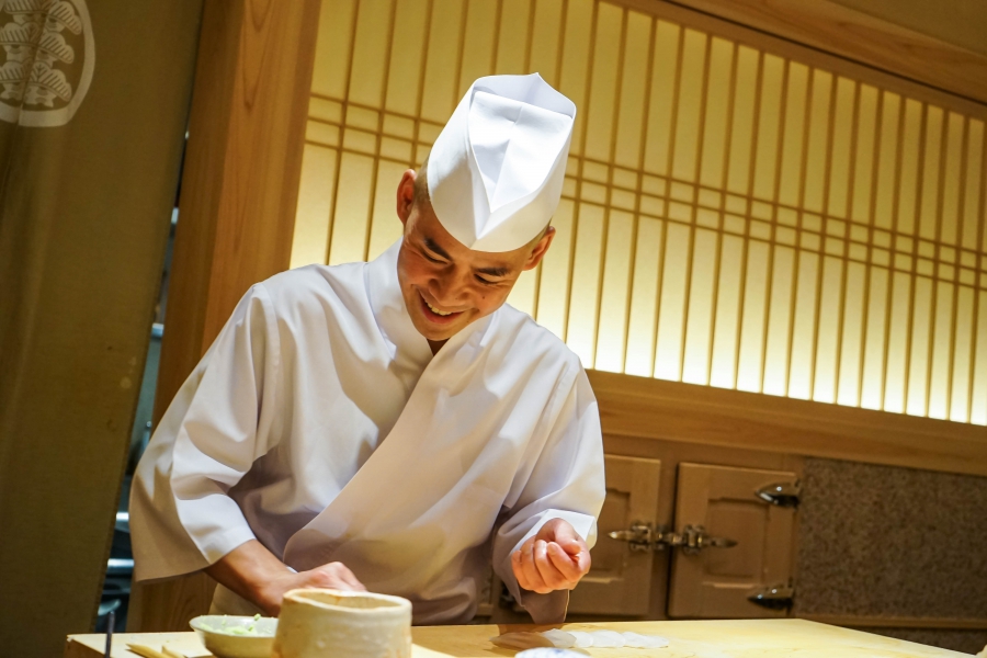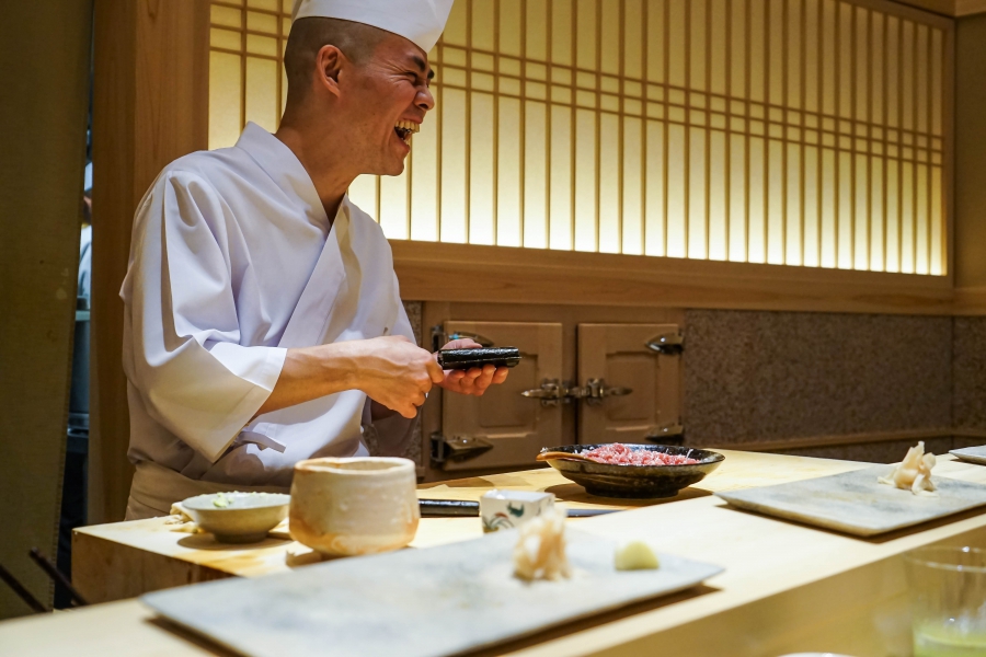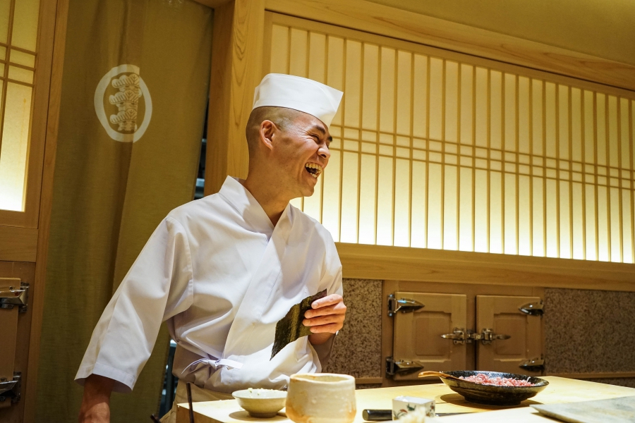 齋藤壽司自二〇〇八年起,以一年摘一星的速度迅速晉升米其林三星,店主齋藤孝司相當年輕,現年不過四十二歲。其原址位於東京赤坂區一處停車場的對面,一年半前才搬到六本木的現址,店面變得明亮了,卻仍堅守迷你尺寸,幾乎由齋藤師傅一人在板前處理所有魚料。