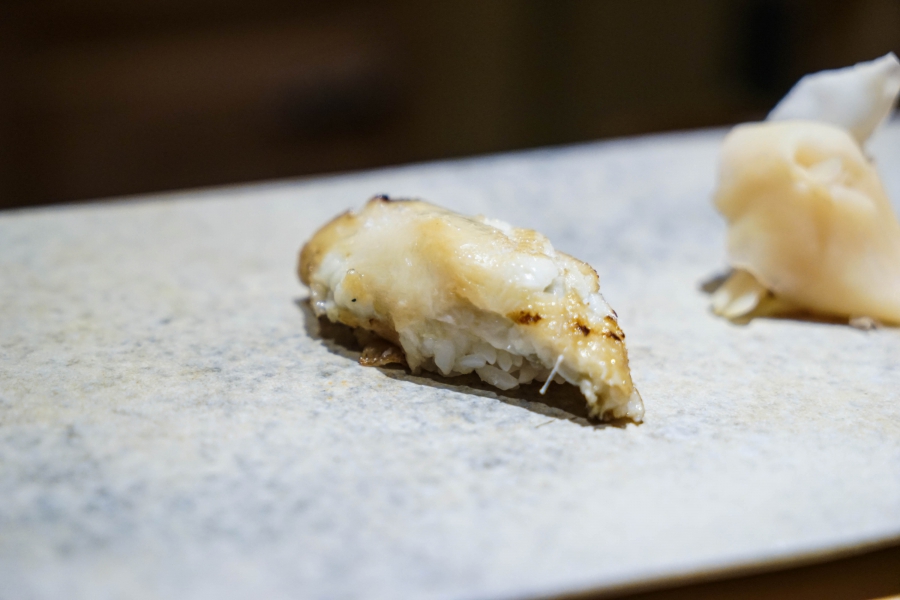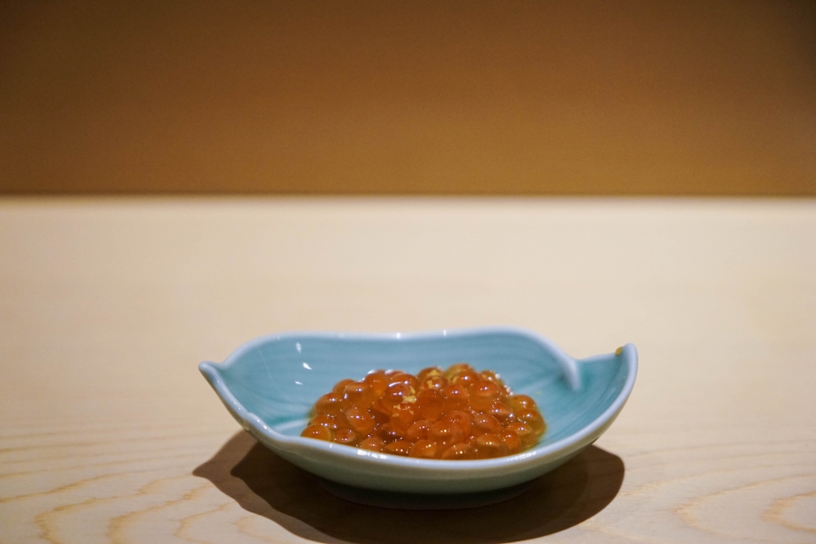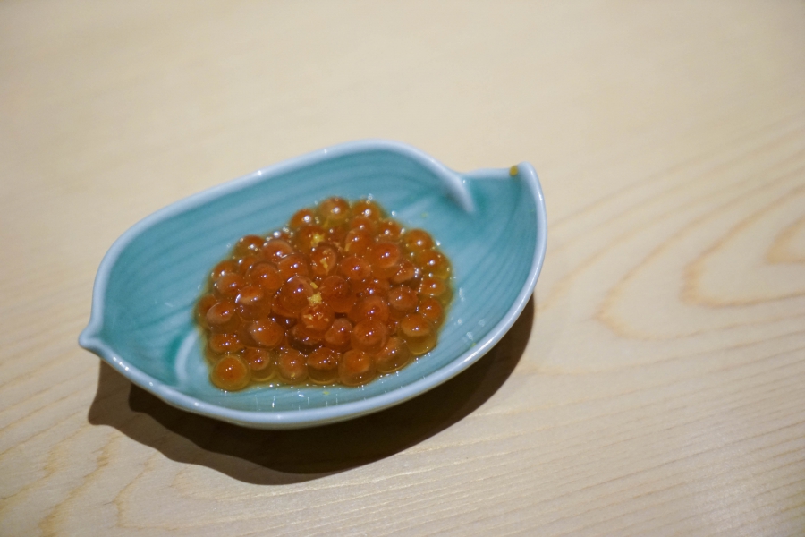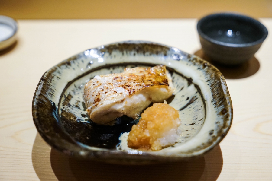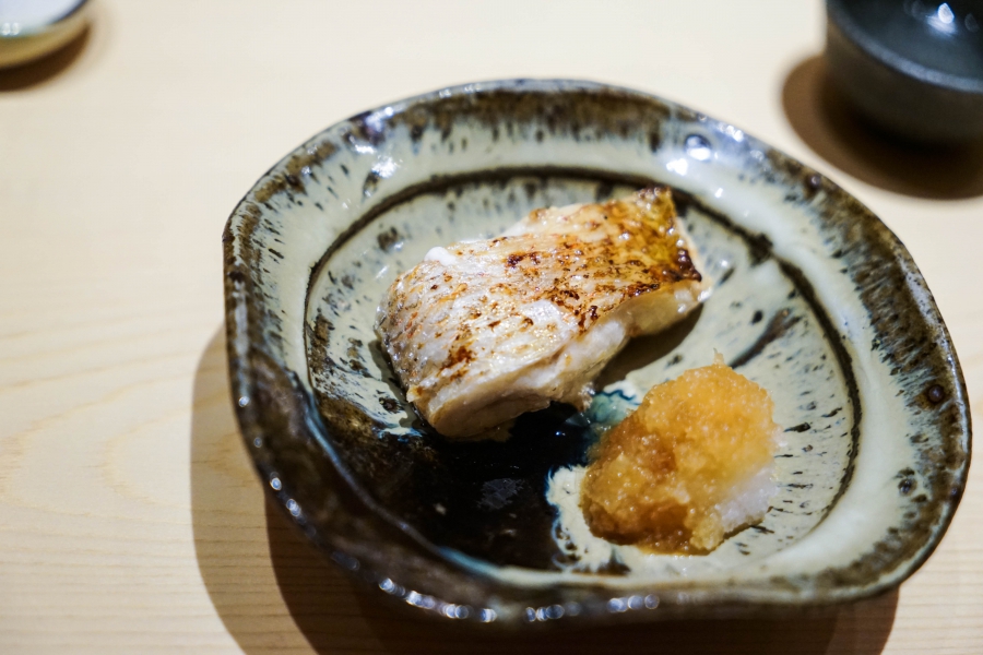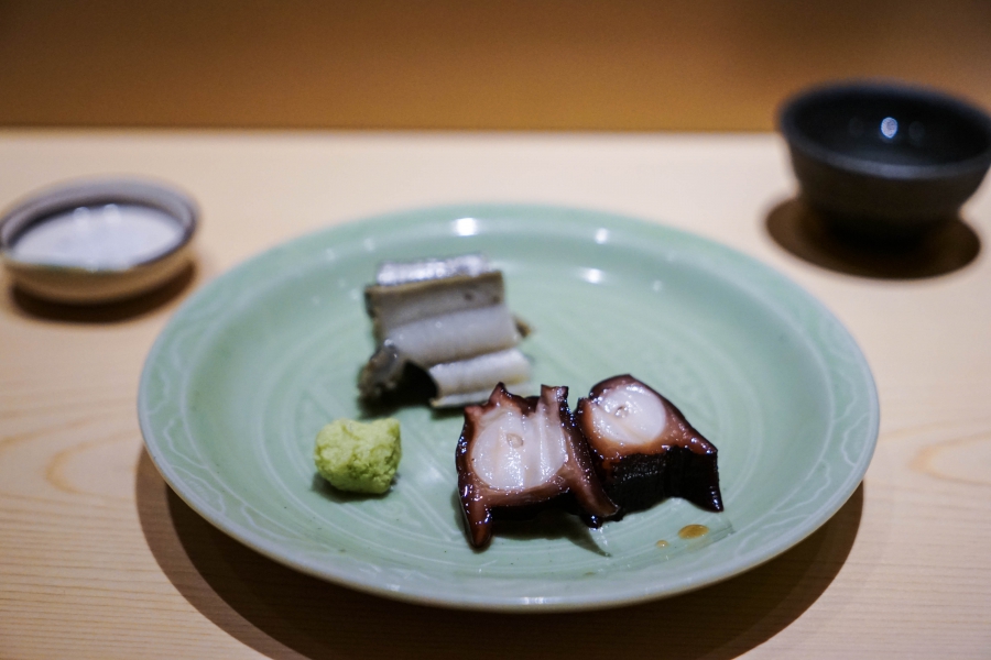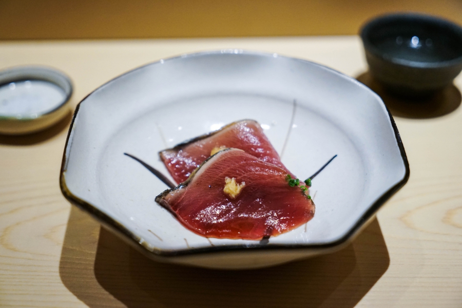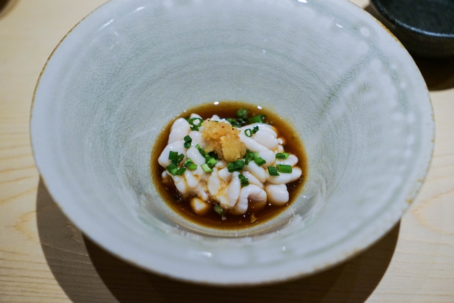 坐定後,先由酒肴開始。新鮮鮭魚卵佐柚皮,嗶嗶波波在口中爆出清新鮮鹹;煮章魚滷得稍甜,一咬即斷而不失彈性;鰹魚tataki(炙燒鰹魚,表面焦熟內部仍生),切片後浸一下柴魚高湯醬油,軟腴芬芳;鱈魚白子搭佐自家製椪醋及辣蘿蔔泥,要一口吞下其肥美濃郁,才不會被椪醋的酸味搶了風采。
