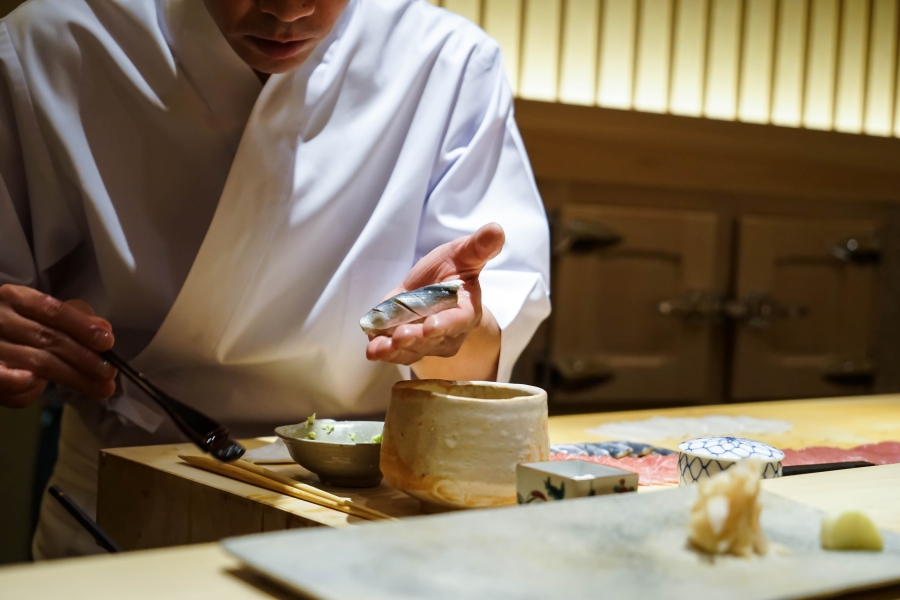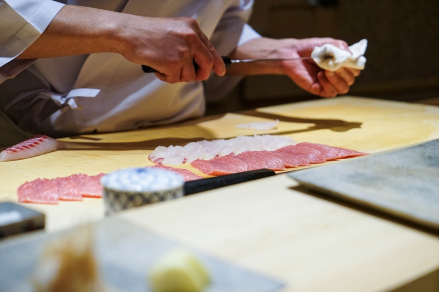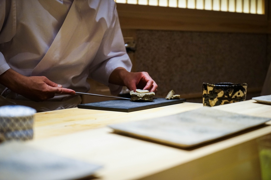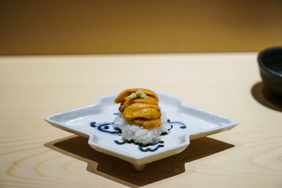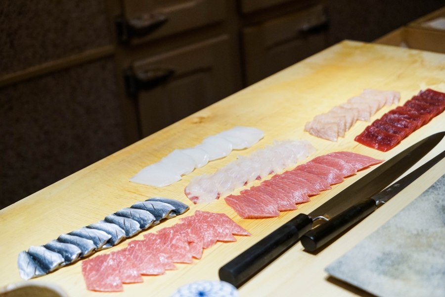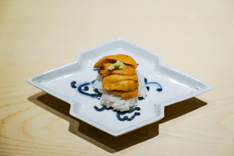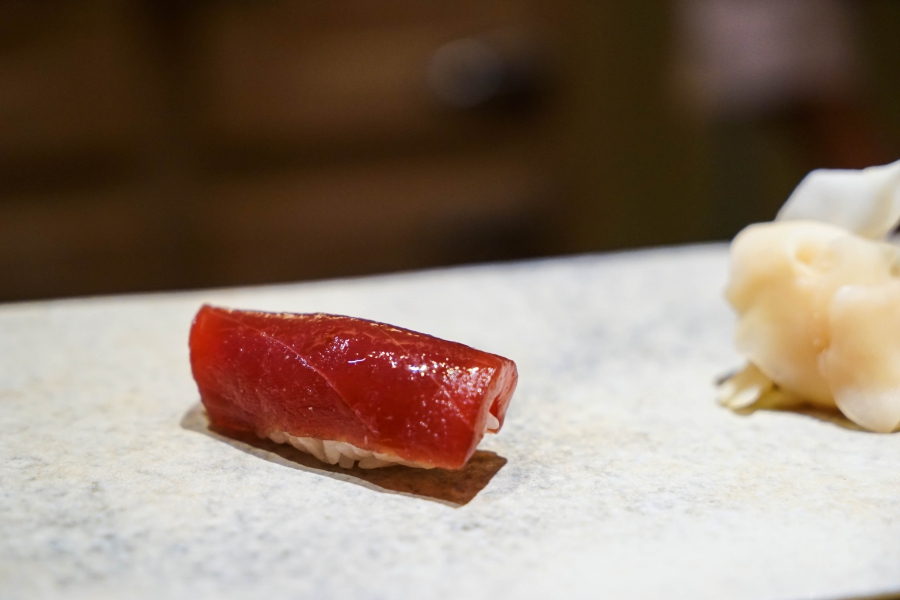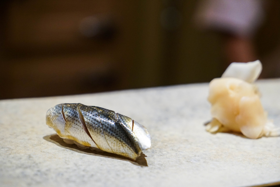 坐定後,先由酒肴開始。新鮮鮭魚卵佐柚皮,嗶嗶波波在口中爆出清新鮮鹹;煮章魚滷得稍甜,一咬即斷而不失彈性;鰹魚tataki(炙燒鰹魚,表面焦熟內部仍生),切片後浸一下柴魚高湯醬油,軟腴芬芳;鱈魚白子搭佐自家製椪醋及辣蘿蔔泥,要一口吞下其肥美濃郁,才不會被椪醋的酸味搶了風采。