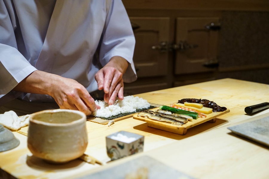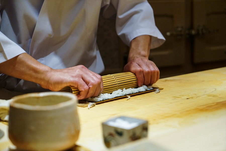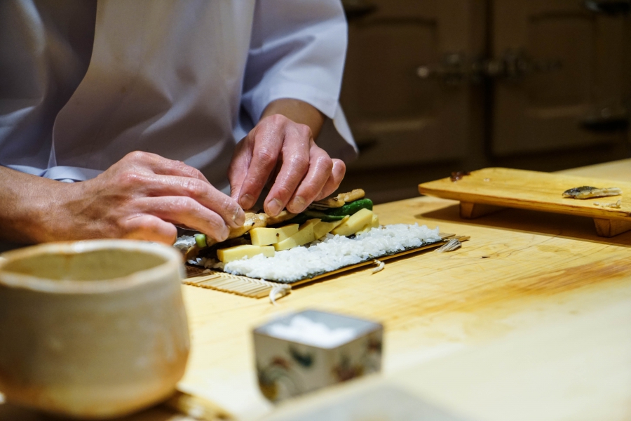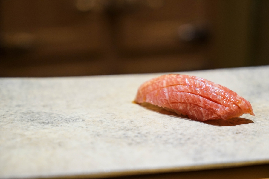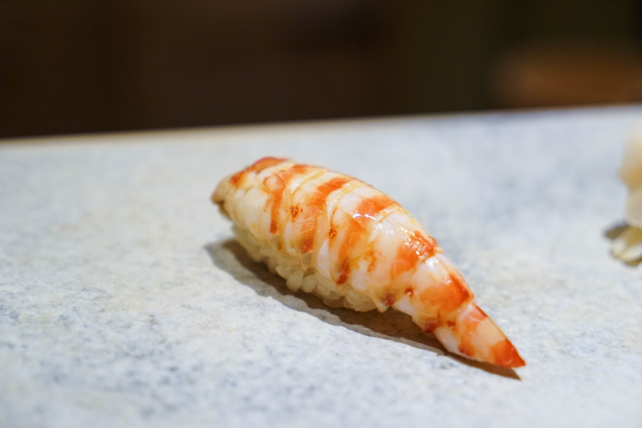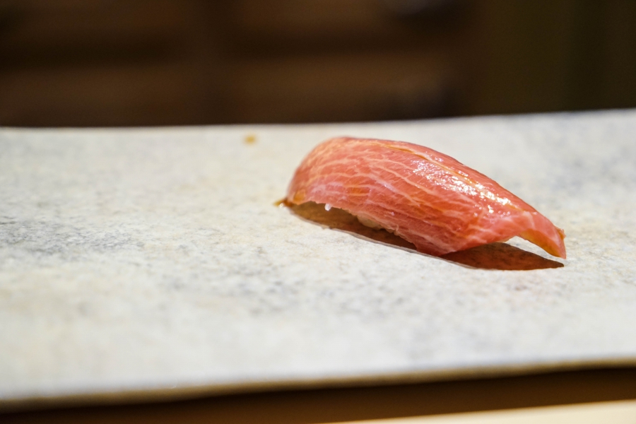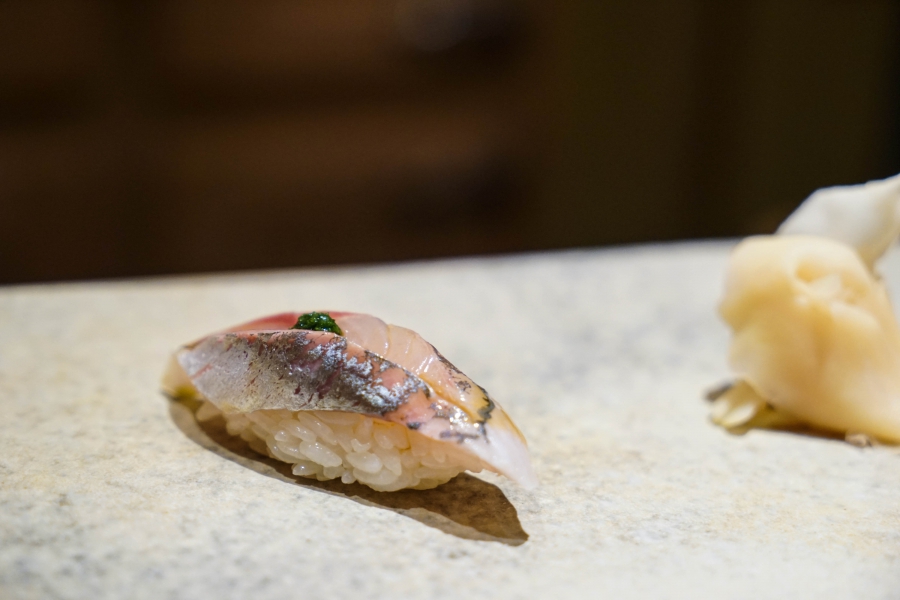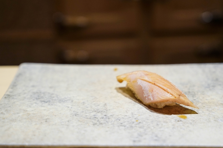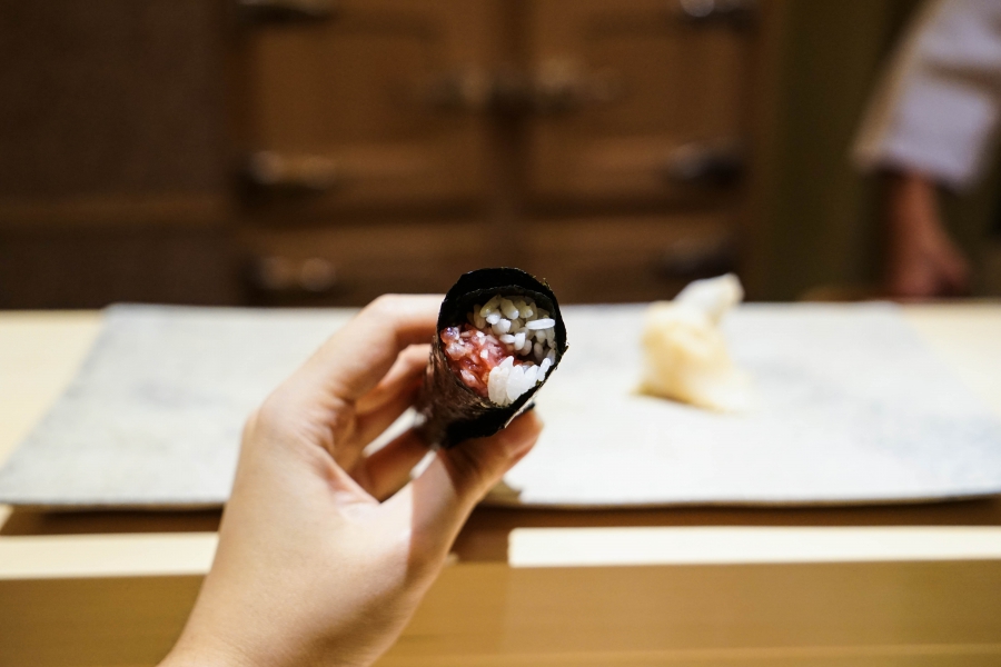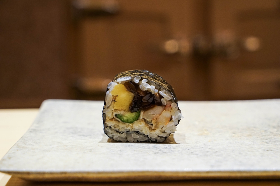 我們一邊吃,齋藤師傅一邊開始準備壽司料。他不斷運刀,行雲流水間浮現片片魚生,直到砧板上幾乎排不下了,才開始捏壽司。當日的鰤魚好肥,一入口就消融無形,與溫度稍高、醋味較淺的醋飯相當契合;小鰶魚也柔軟小巧,與傳統江戶前相比較不鹹酸,因為醃漬時間較短,但也因此比較符合我的口味;鮪魚赤身耀眼得彷彿紅寶石,軟滑而與醋飯完美融合;車蝦雖然身形嬌小,但煮到保有彈性又易咬,可一口完食;鹽味、醬味二種穴子魚,提供有趣對比;招牌的太卷則讓人心滿意足,據說這可是熟客拿去獻寶的頂級野餐便當呢。
