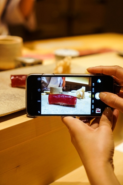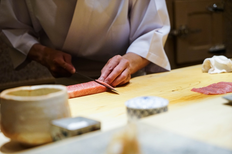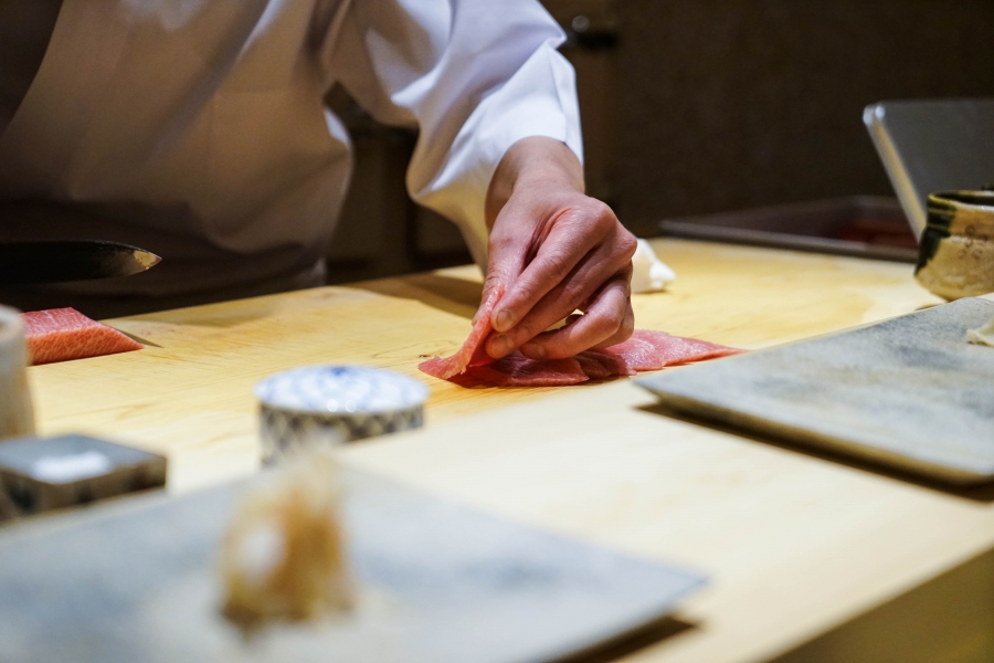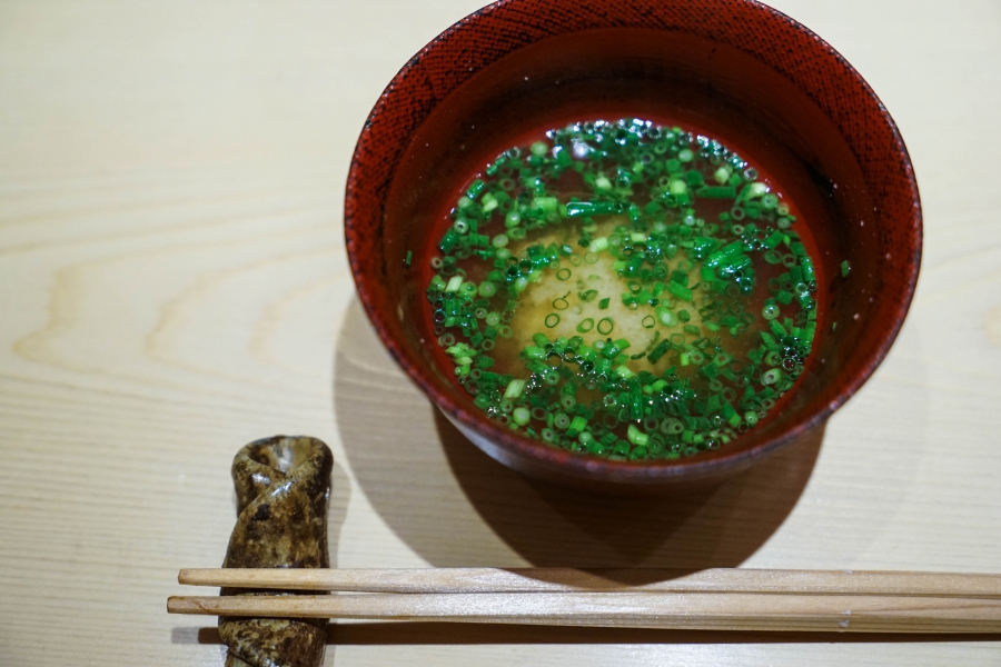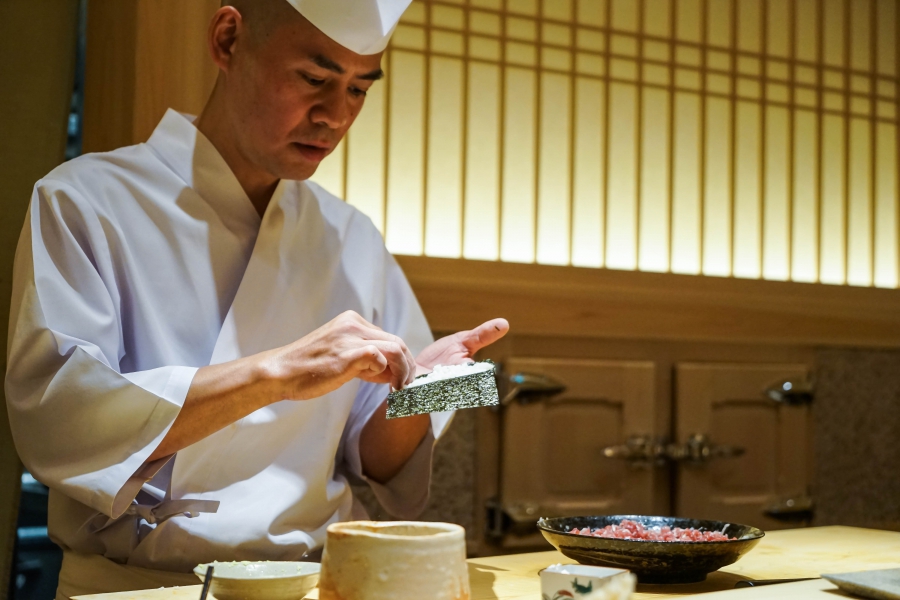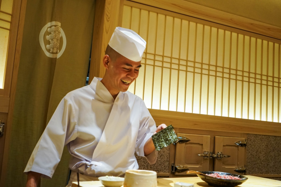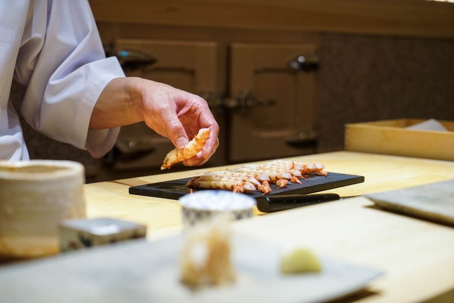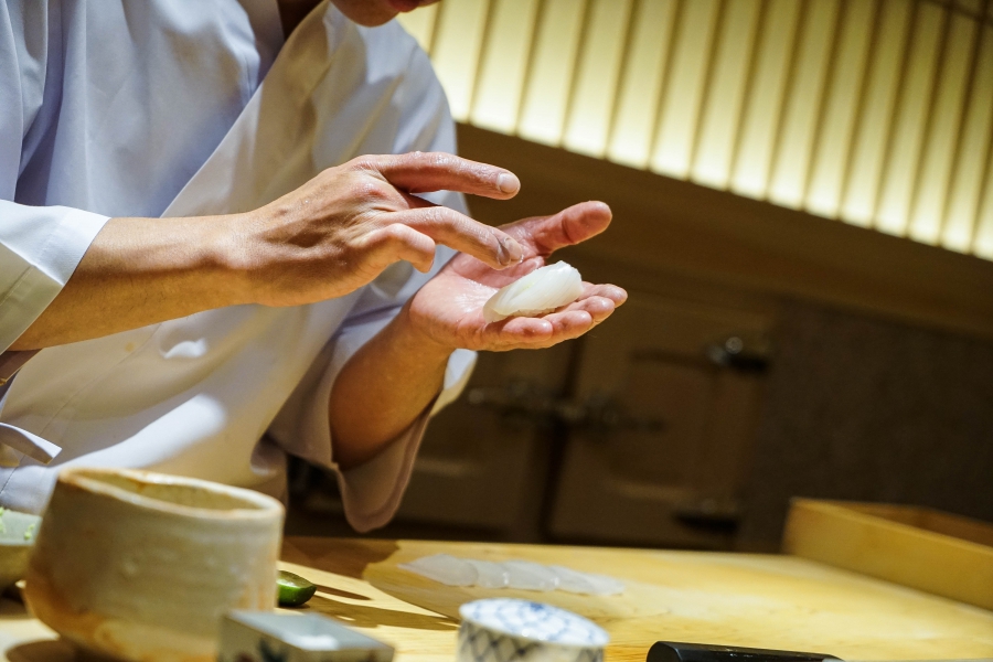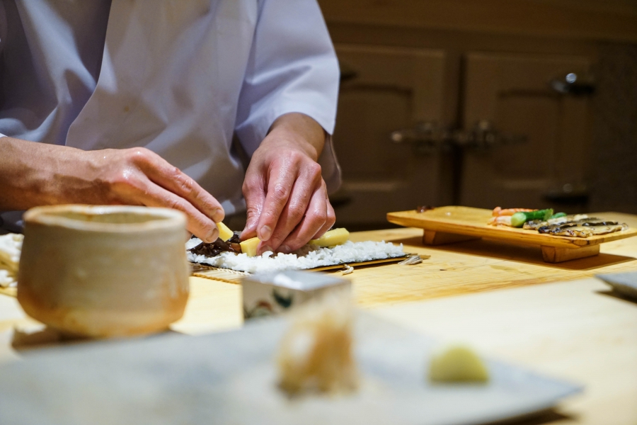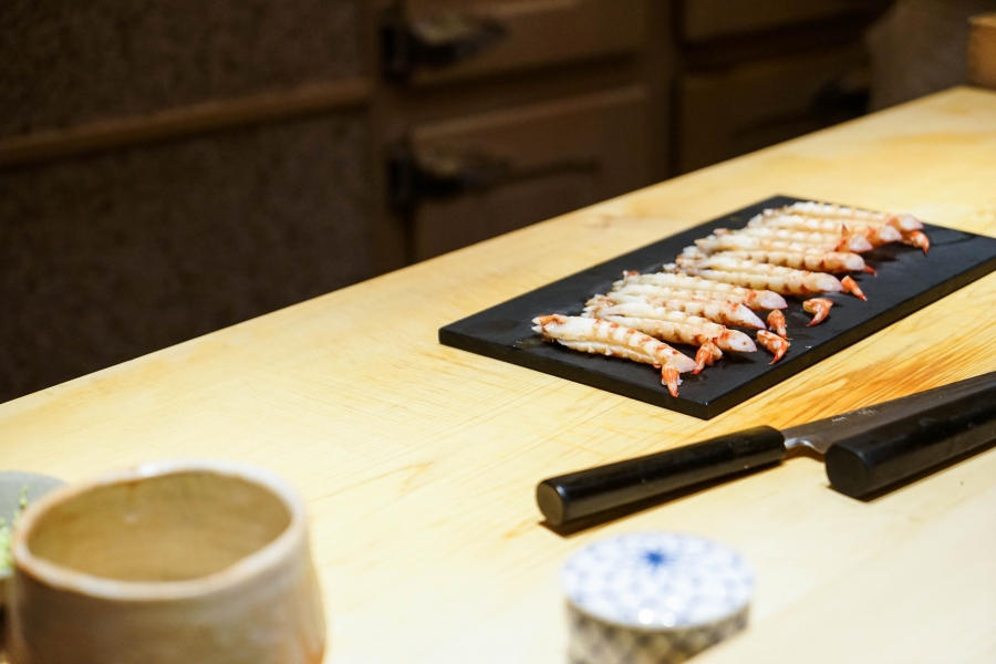 我們一邊吃,齋藤師傅一邊開始準備壽司料。他不斷運刀,行雲流水間浮現片片魚生,直到砧板上幾乎排不下了,才開始捏壽司。當日的鰤魚好肥,一入口就消融無形,與溫度稍高、醋味較淺的醋飯相當契合;小鰶魚也柔軟小巧,與傳統江戶前相比較不鹹酸,因為醃漬時間較短,但也因此比較符合我的口味;鮪魚赤身耀眼得彷彿紅寶石,軟滑而與醋飯完美融合;車蝦雖然身形嬌小,但煮到保有彈性又易咬,可一口完食;鹽味、醬味二種穴子魚,提供有趣對比;招牌的太卷則讓人心滿意足,據說這可是熟客拿去獻寶的頂級野餐便當呢。
