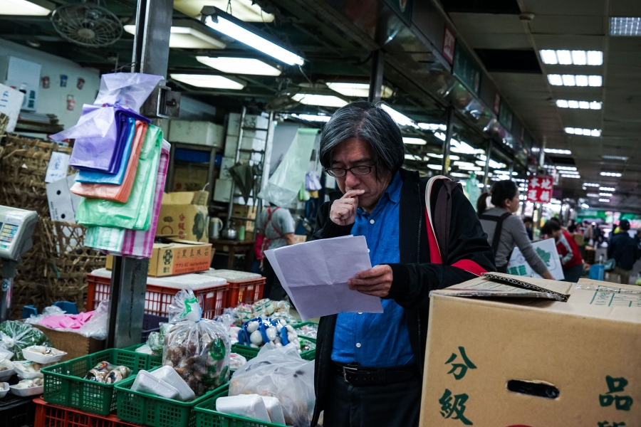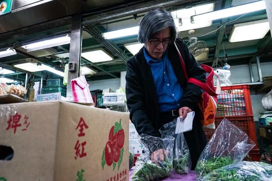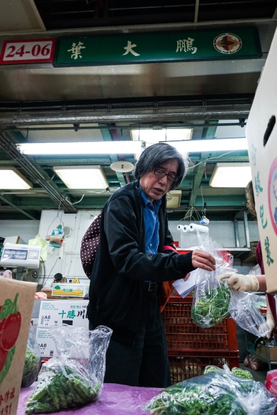 我們抵達葉大鵬蔬菜攤時,還不到早上九點。詹宏志拿出用A4白紙列印出來的採購清單,與老闆娘阿美一一核對訂購的菜,豌豆仁、秋葵、各式香草,袋子愈來愈多;過一會兒,詹宏志開心地揮手打招呼,原來是葉大鵬回來了。