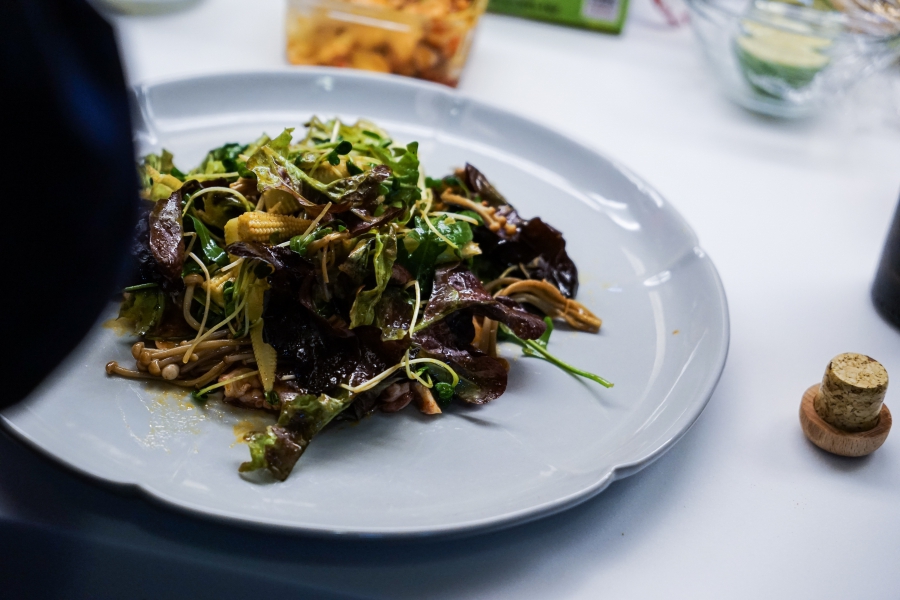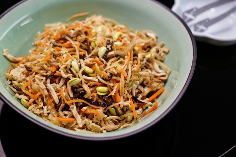 章魚沙拉、秋葵鮪魚、檸檬干貝、桔香九孔都是詹宏志的作品,或酸香清新,或重口有勁,搭配王宣一的如意菜。如意菜難在刀工,豆乾、蔬菜等十種材料得切成細絲,再一一入鍋拌炒,做起來費力,逢年過節才有得吃。我當晚吃到的如意菜,酸甜細嫩,應是花瓜、醃薑、酸菜等漬物所致,與我家的口味很不相同。是的,我家過年時也有這道菜,我們稱之為「素什錦」或「十樣菜」,不放花瓜、醃薑、酸菜,但有雪菜、冬筍、蓮藕,黃豆芽、豆乾、胡蘿蔔、木耳則為共通。我們的味覺記憶竟然因此串連了起來。