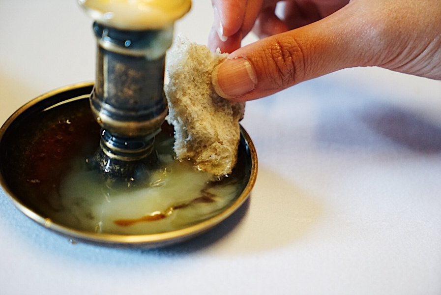 真相大白,原來蠟燭是用豬油做的!深褐色液體則是五印陳醋!在這裡端不出橄欖油加巴薩米可醋,改成豬油與五印醋反而合情合理,事實上是合理地讓人想拍腦袋三下,虧他想得出來!